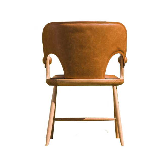 Com duas asas que brotam do assento e sustentam o espaldar, a cadeira traz a sensação de abraçar quem está sentado. O assento estofado em couro e sem costura é encaixado em sua base.
