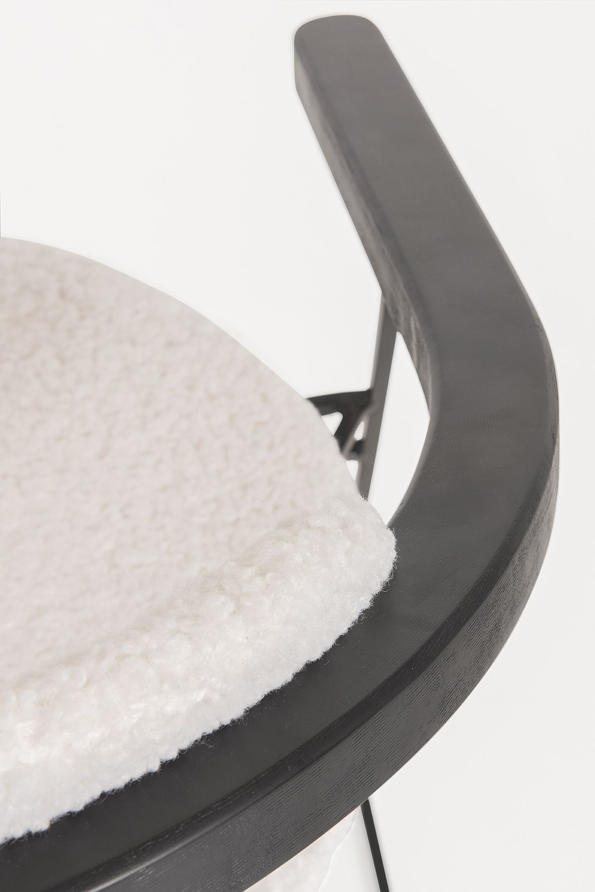 Cadeira estofada. Estrutura em aço carbono pintada. Braços em madeira tingida. Encosto e assento estofados.