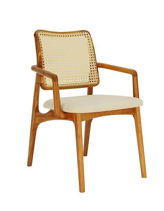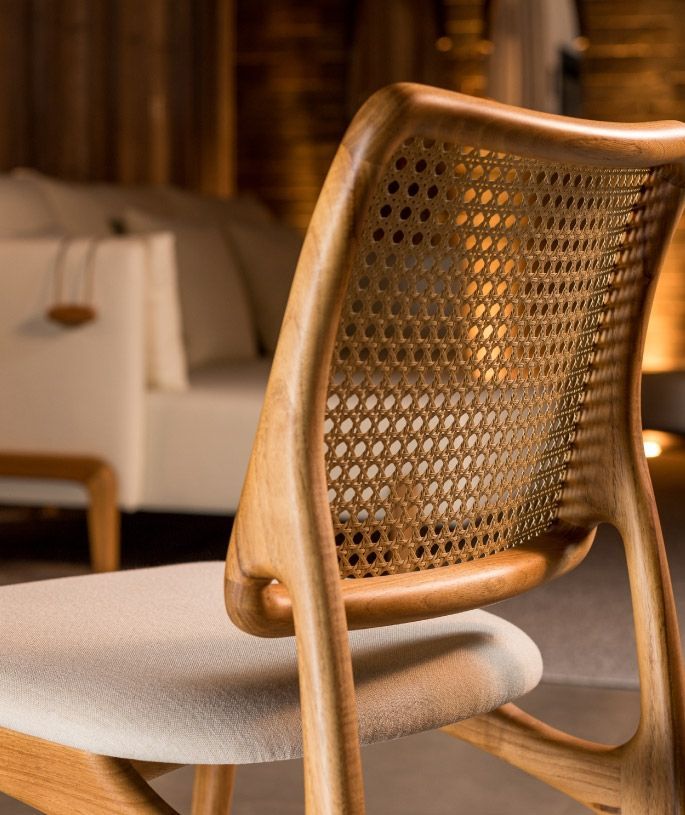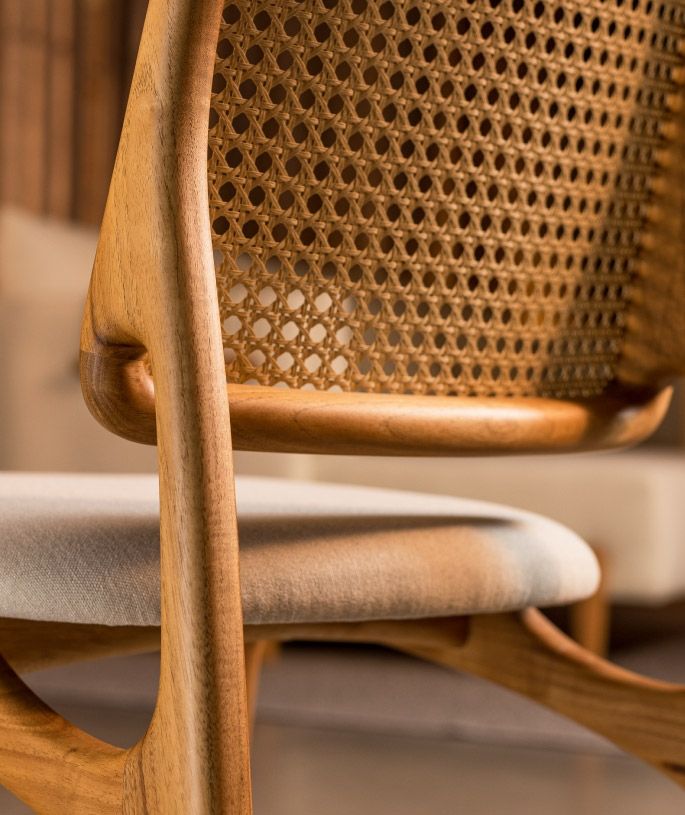 Os primeiros esboços da cadeira Pitanga aliam o traço orgânico à expertise da marcenaria tradicional. O desenho expressivo, da estrutura, ganha força pela transparência do espaldar em palhinha e pela soltura do assento estofado.