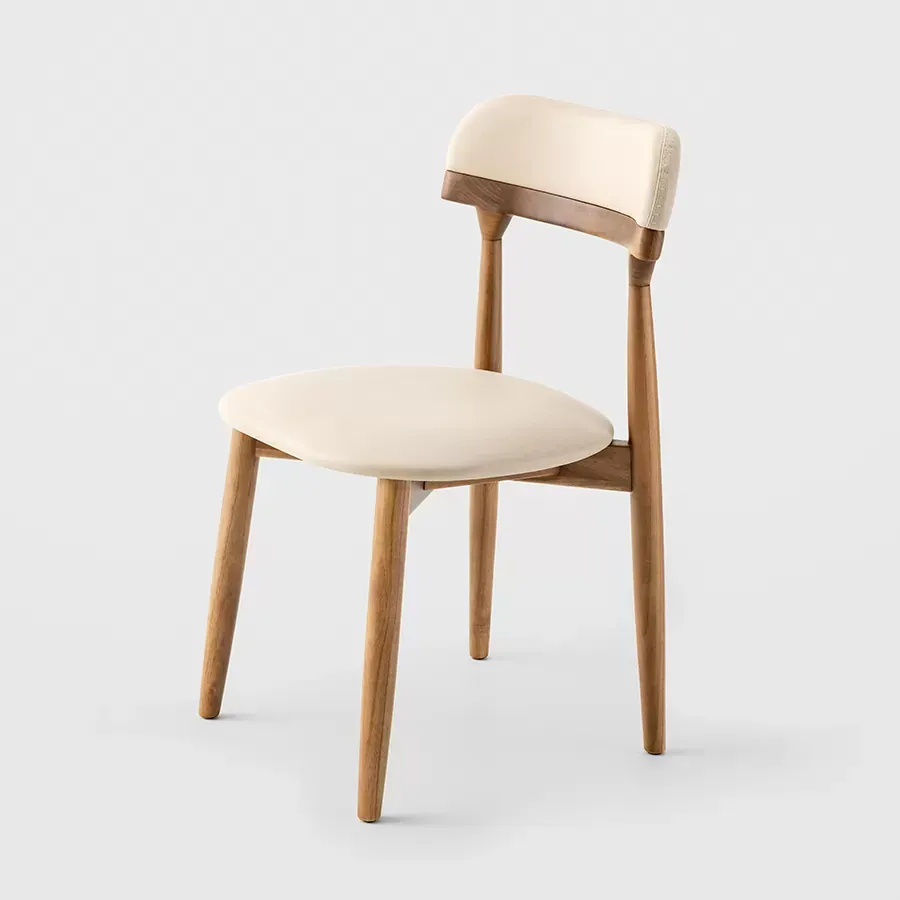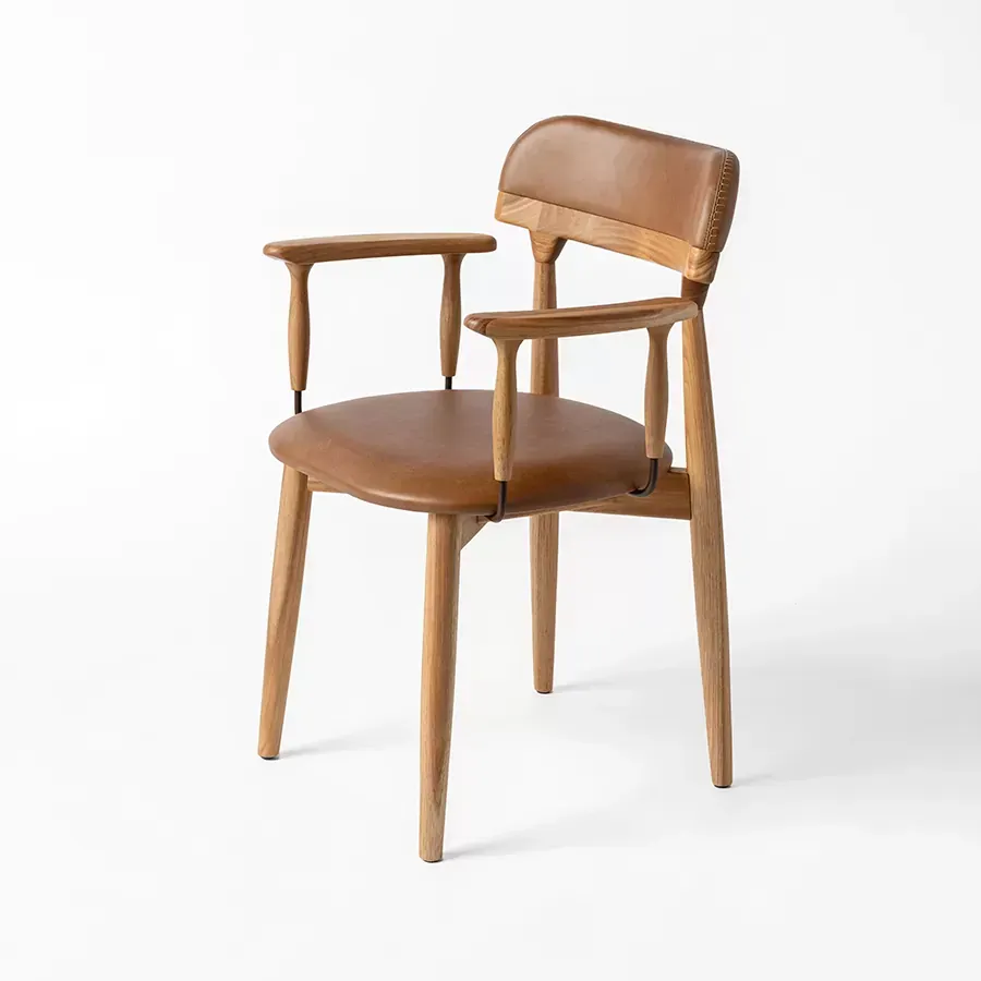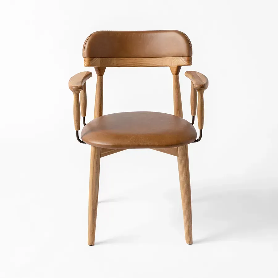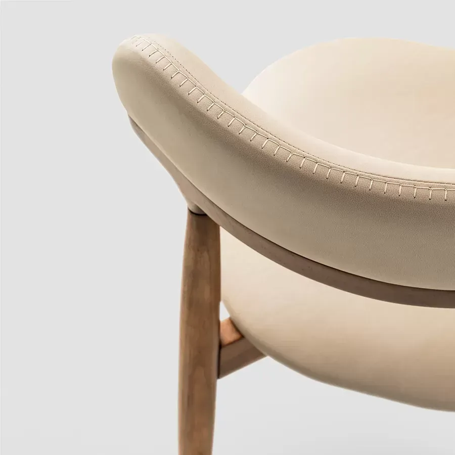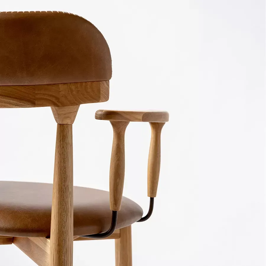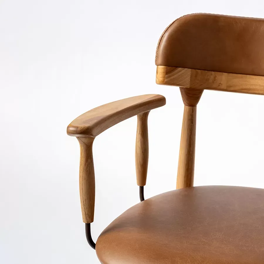 A postura vigilante do pássaro símbolo do Rio Grande do Sul, o quero-quero, foi o ponto de partida do desenho desta cadeira. A estrutura esguia, dos pés traseiros, pontua a união entre a madeira e a parte estofada do espaldar. Uma única costura com pesponto de linha grossa chama atenção no topo do encosto.
