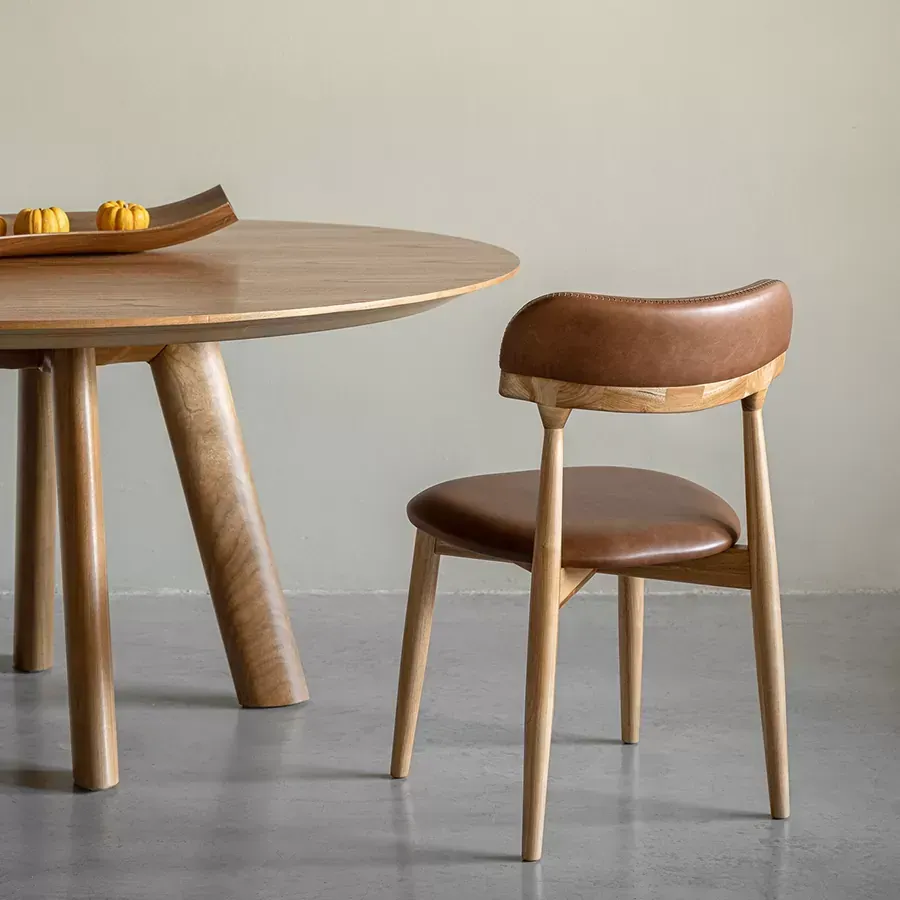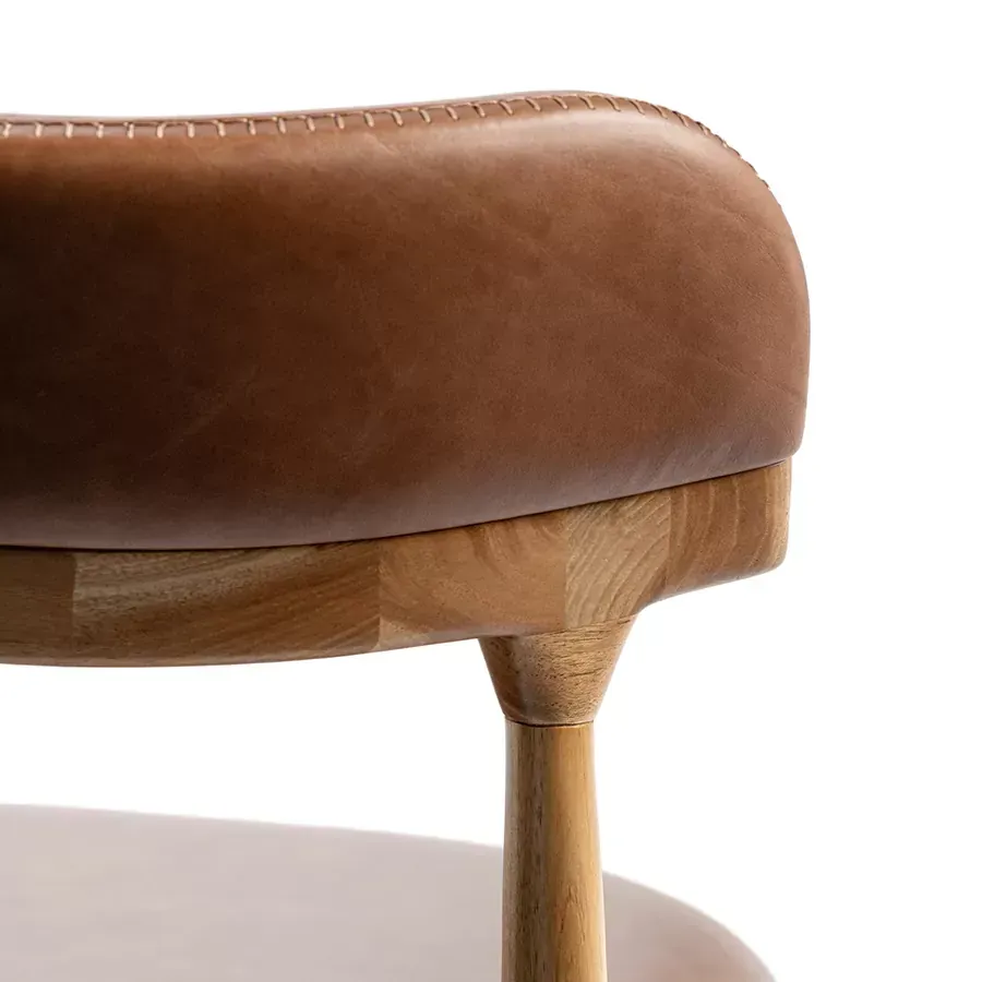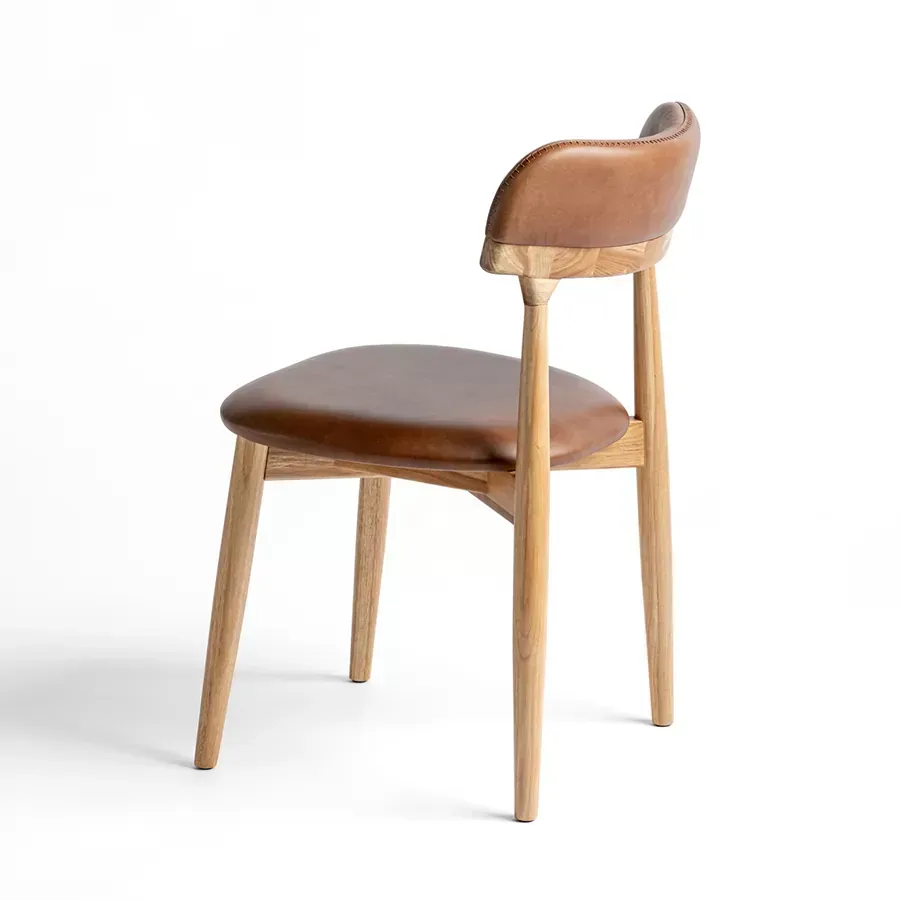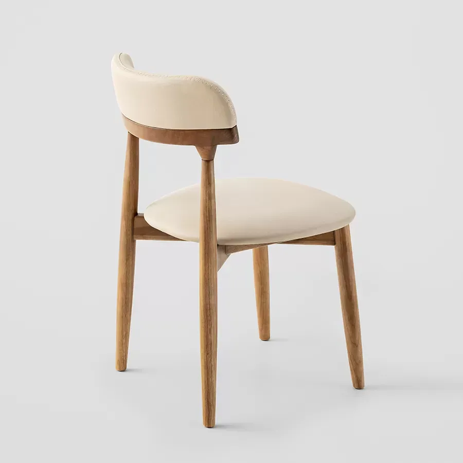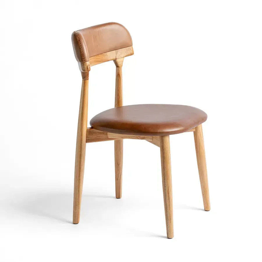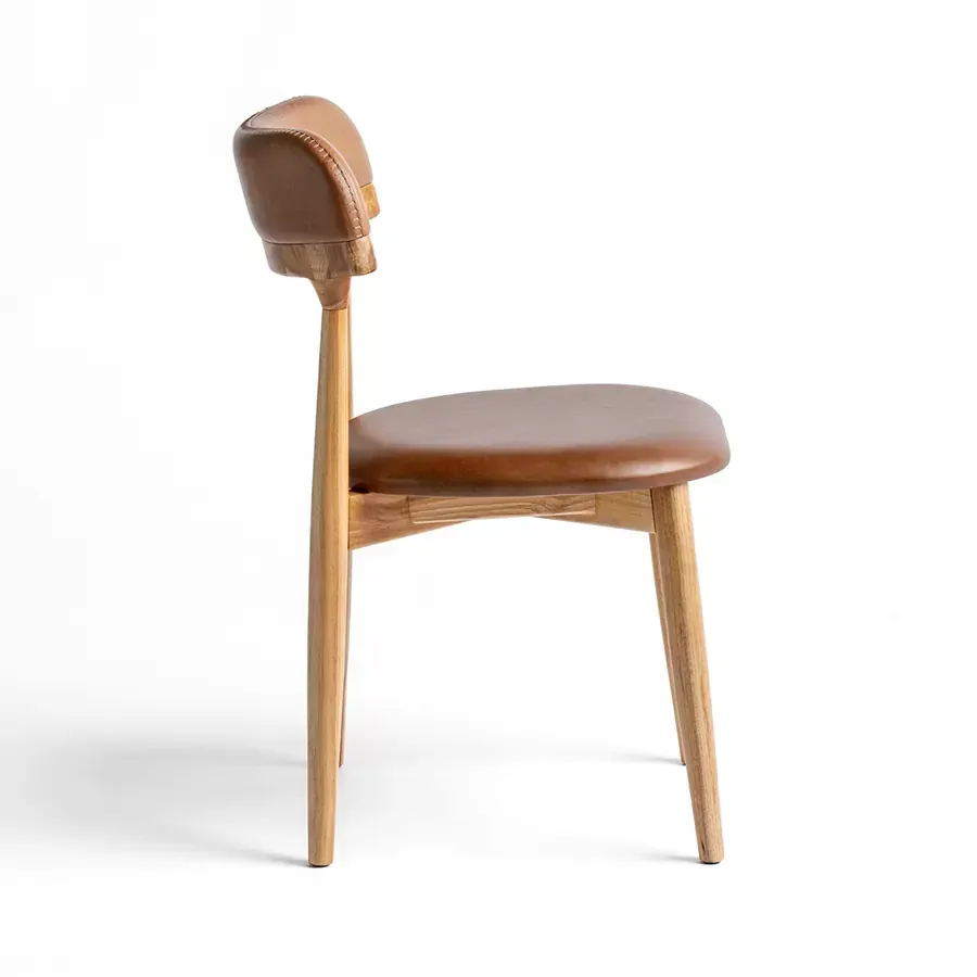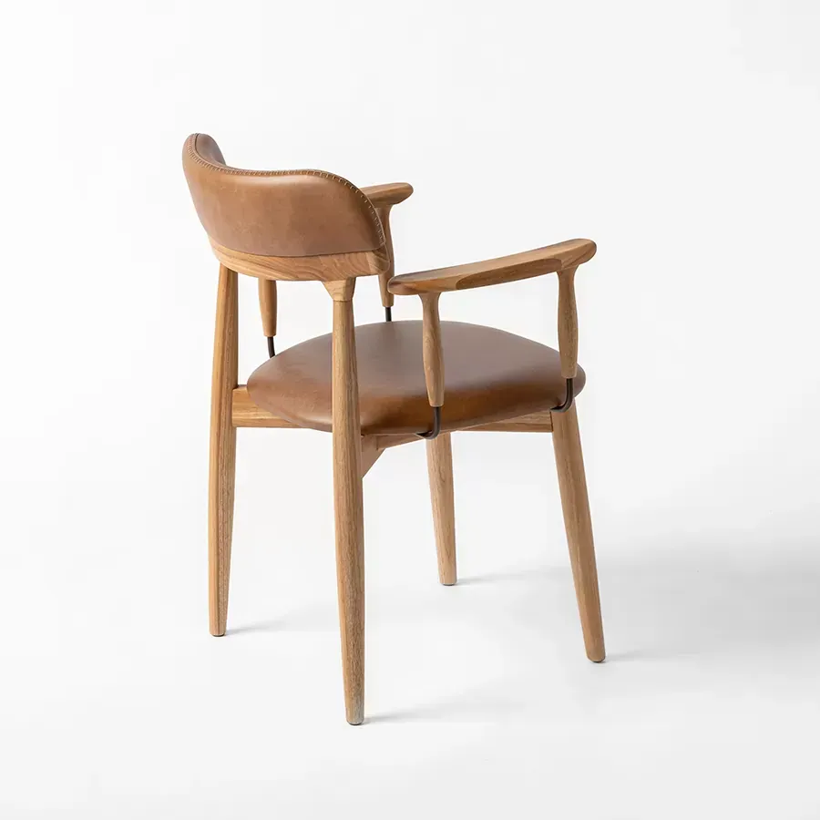 A postura vigilante do pássaro símbolo do Rio Grande do Sul, o quero-quero, foi o ponto de partida do desenho desta cadeira. A estrutura esguia, dos pés traseiros, pontua a união entre a madeira e a parte estofada do espaldar. Uma única costura com pesponto de linha grossa chama atenção no topo do encosto.