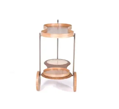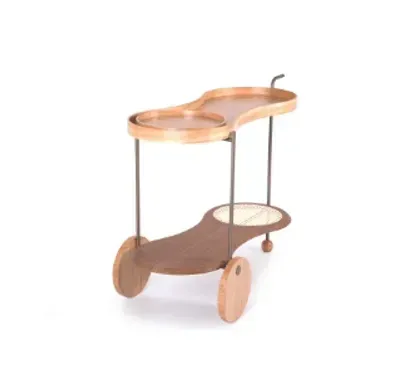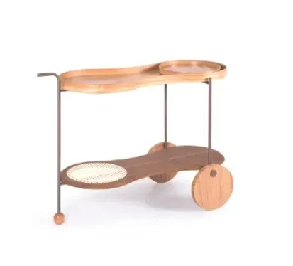 Estrutura em aço carbono com acabamento de pintura automotiva ou pintura eletrostática, tampos de mdf laminados em recouro reconstituído e lâmina de madeira natural, palha natural e esfera madeira tingida.