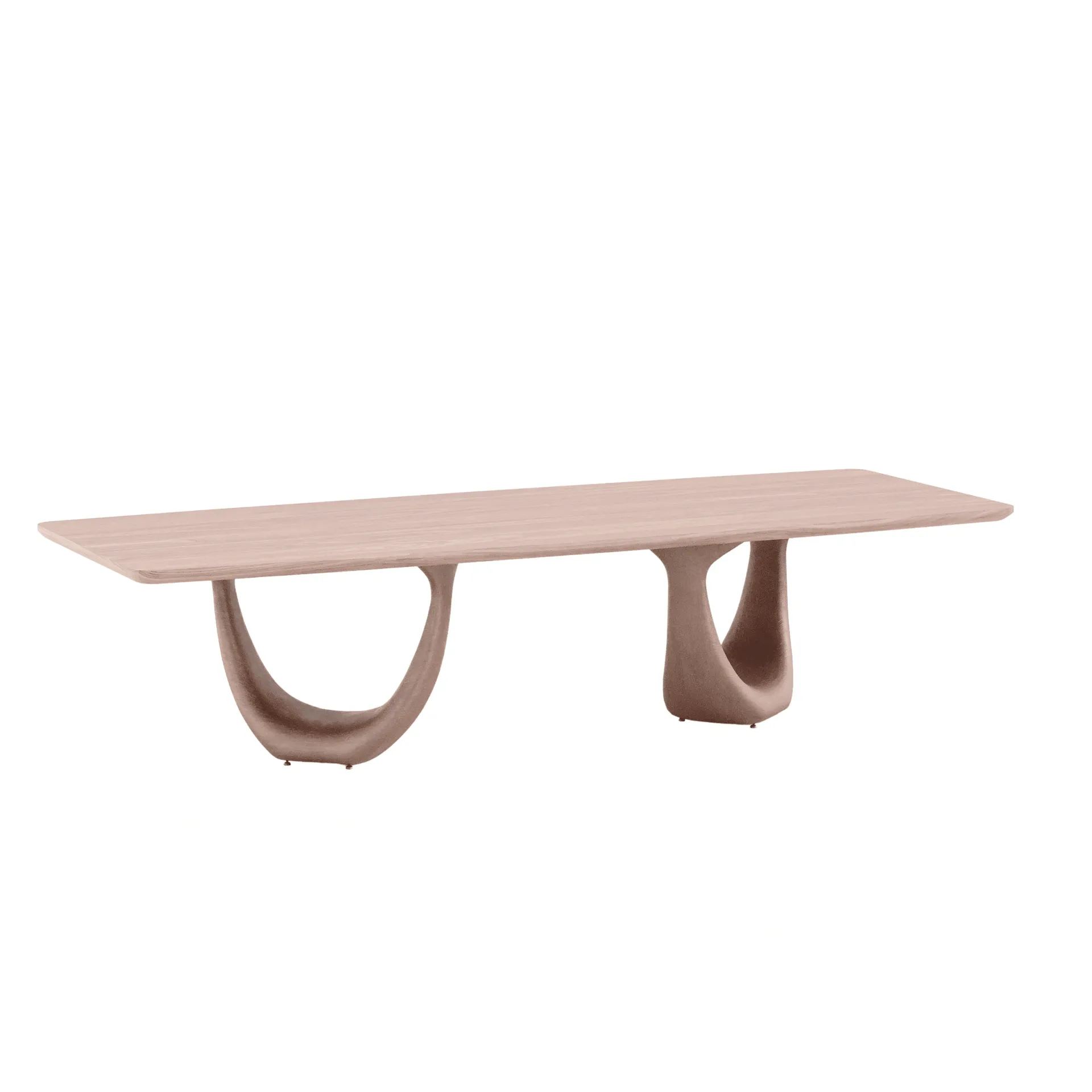 As bases maciças em madeira são modeladas como curvas contínuas, que se abrem no centro e retornam ao solo em um gesto fluido, quase coreográfico.