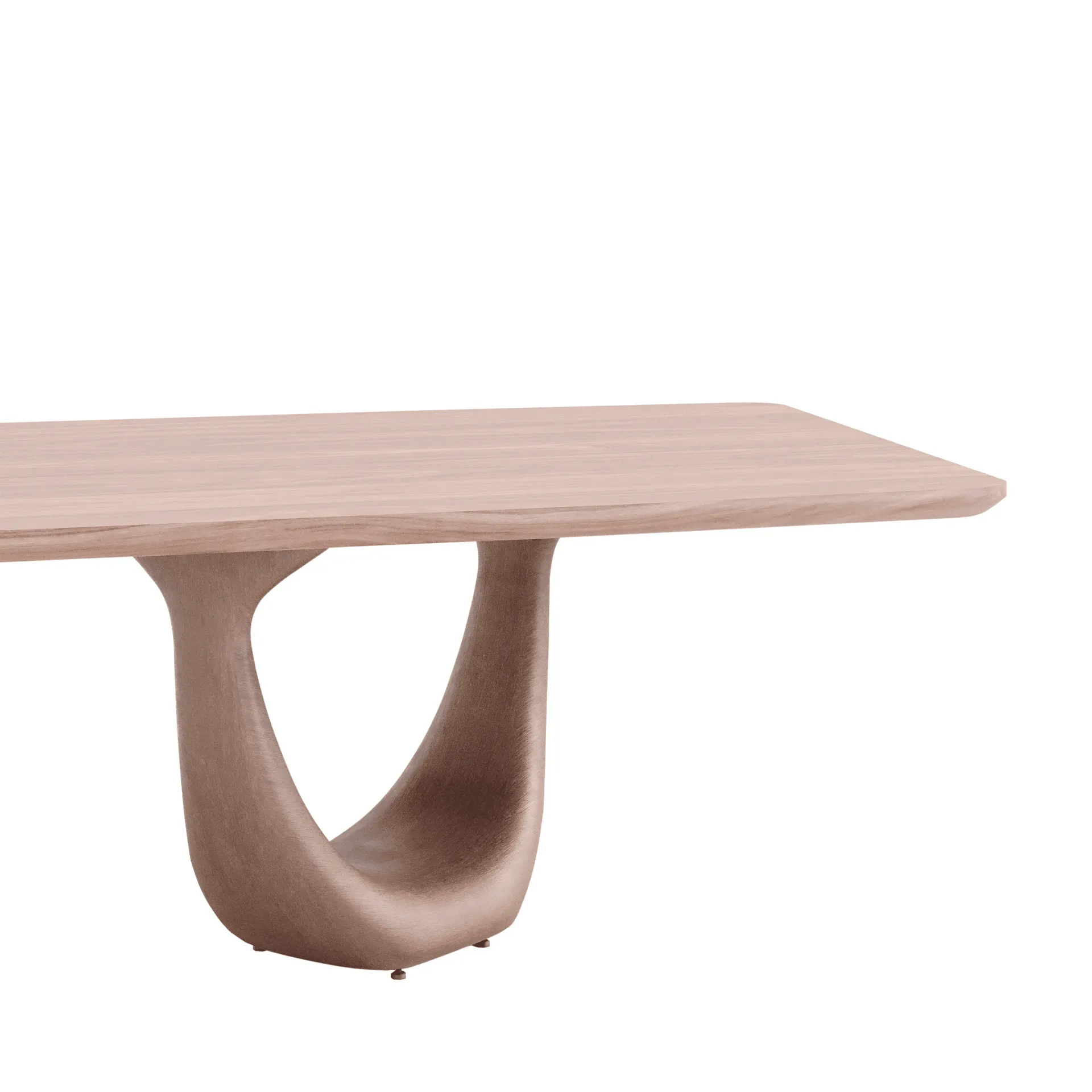 O tampo, esculpido com bordas chanfradas, amplia a percepção de leveza e se projeta suavemente além das bases, reforçando a tensão formal entre flutuação e apoio.
