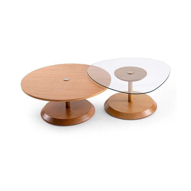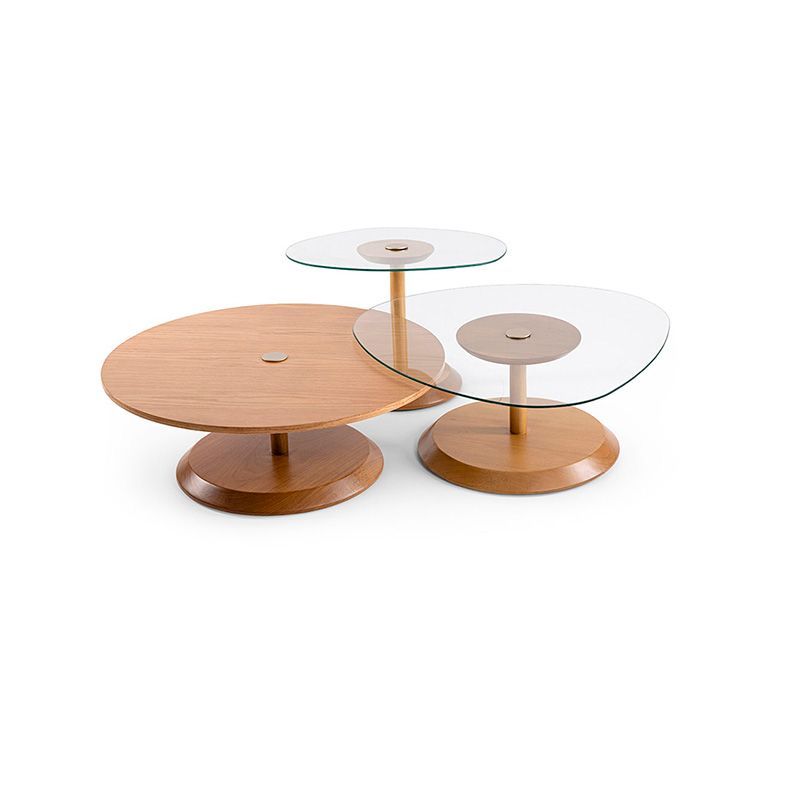 Há também o modelo com tampo redondo em lâmina natural de madeira ou acabamento em laca