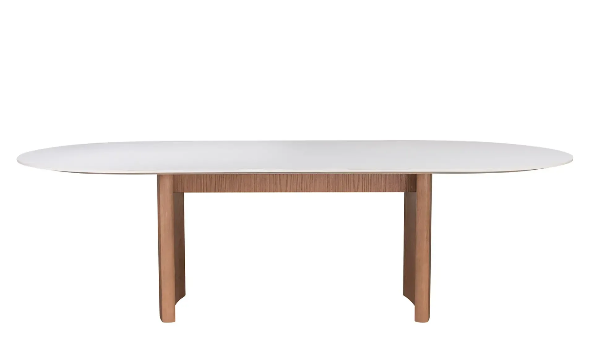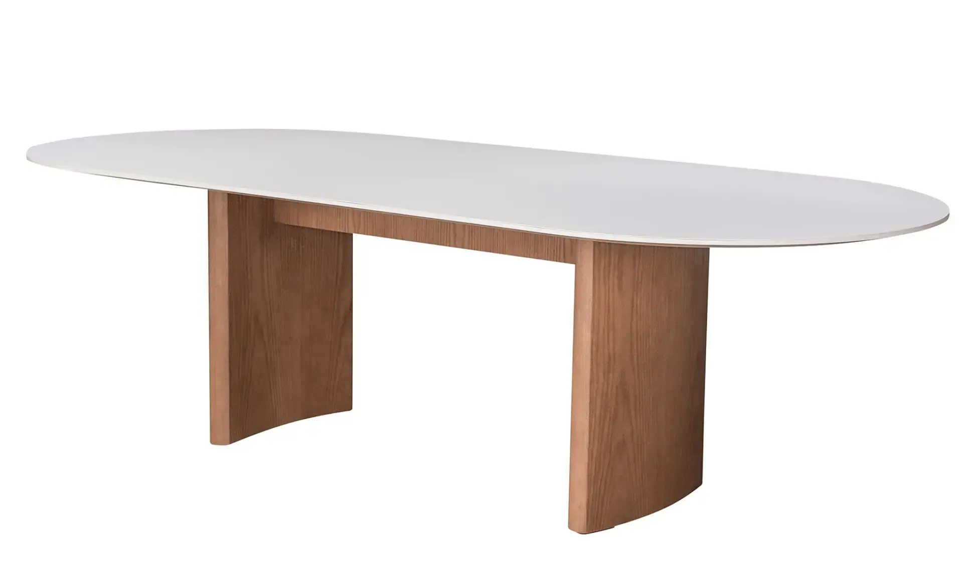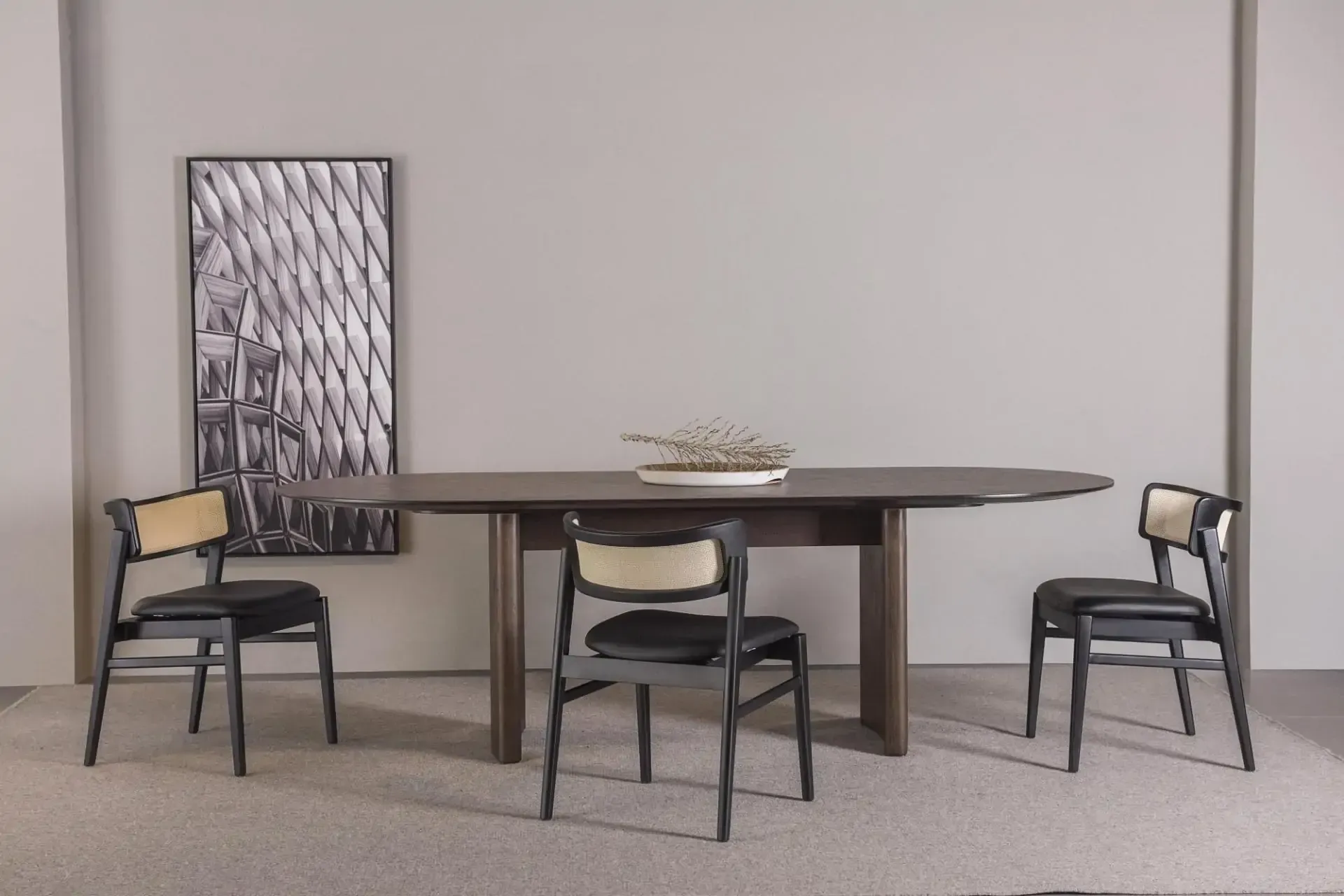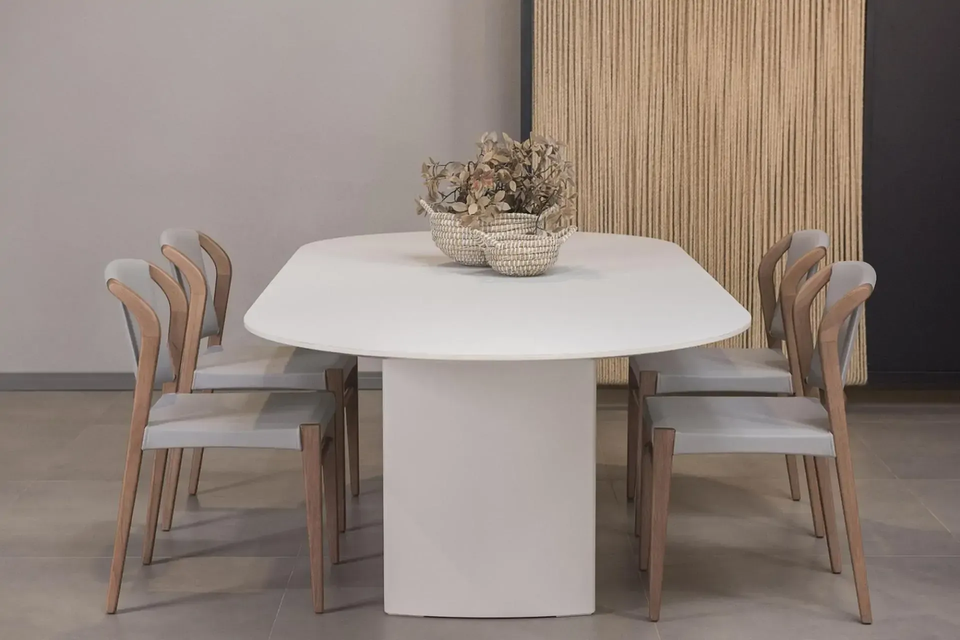 A Mesa Oslo destaca-se pelos traços curvos presentes tanto na base quanto no tampo, criando uma atmosfera mais acolhedora e relaxante. Esses detalhes conferem à mesa uma estética suave e elegante, adicionando uma sensação de nobreza ao ambiente.