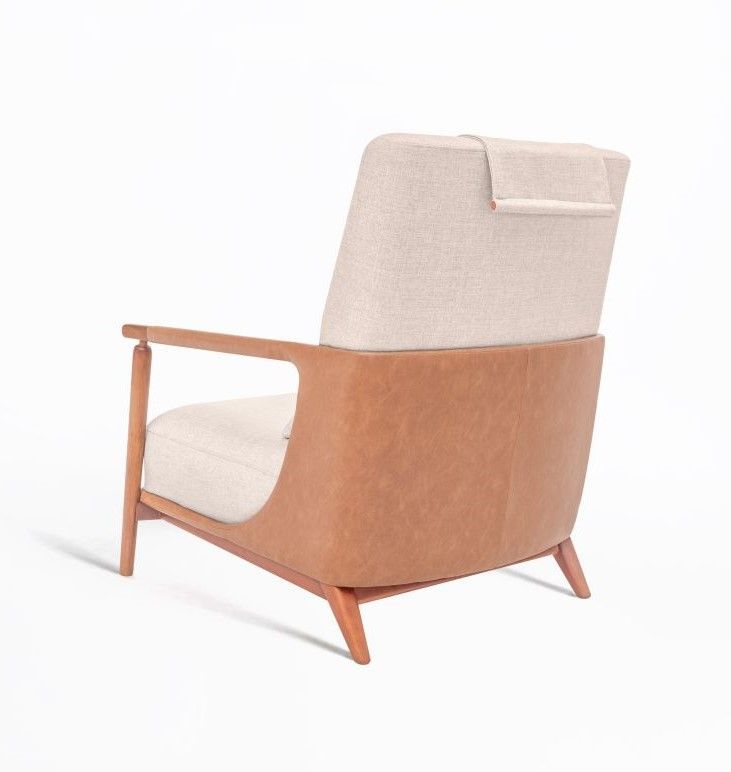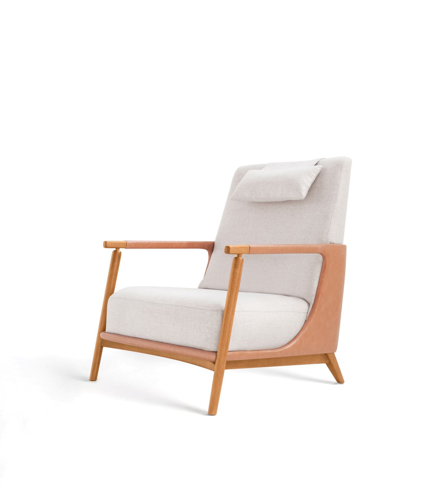 Uma poltrona de relaxamento e cheia de personalidade, com proporções generosas e design expressivo. Possui um encosto alto com apoio de pescoço almofado, detalhes traseiros e laterais com revestimento em couro e pés em madeira maciça. É uma opção muito versátil, que se adequa perfeitamente a vários ambientes e ocasiões: um momento de leitura, de descanso ou até mesmo para amamentação. Ela é uma criação do Studio Asadesign.