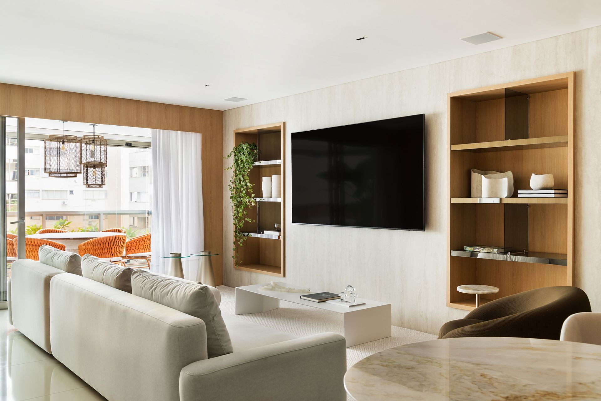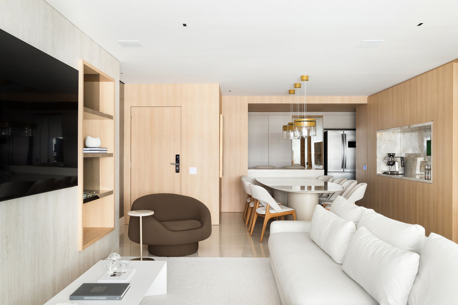Desde o início, o conceito da área social foi desenhado como o ponto central de convivência do apartamento. A integração entre living, cozinha e varanda conecta não apenas ambientes, mas a essência dos moradores: anfitriões natos, que valorizam encontros intimistas, mas também estão sempre prontos para acolher múltiplos convidados.