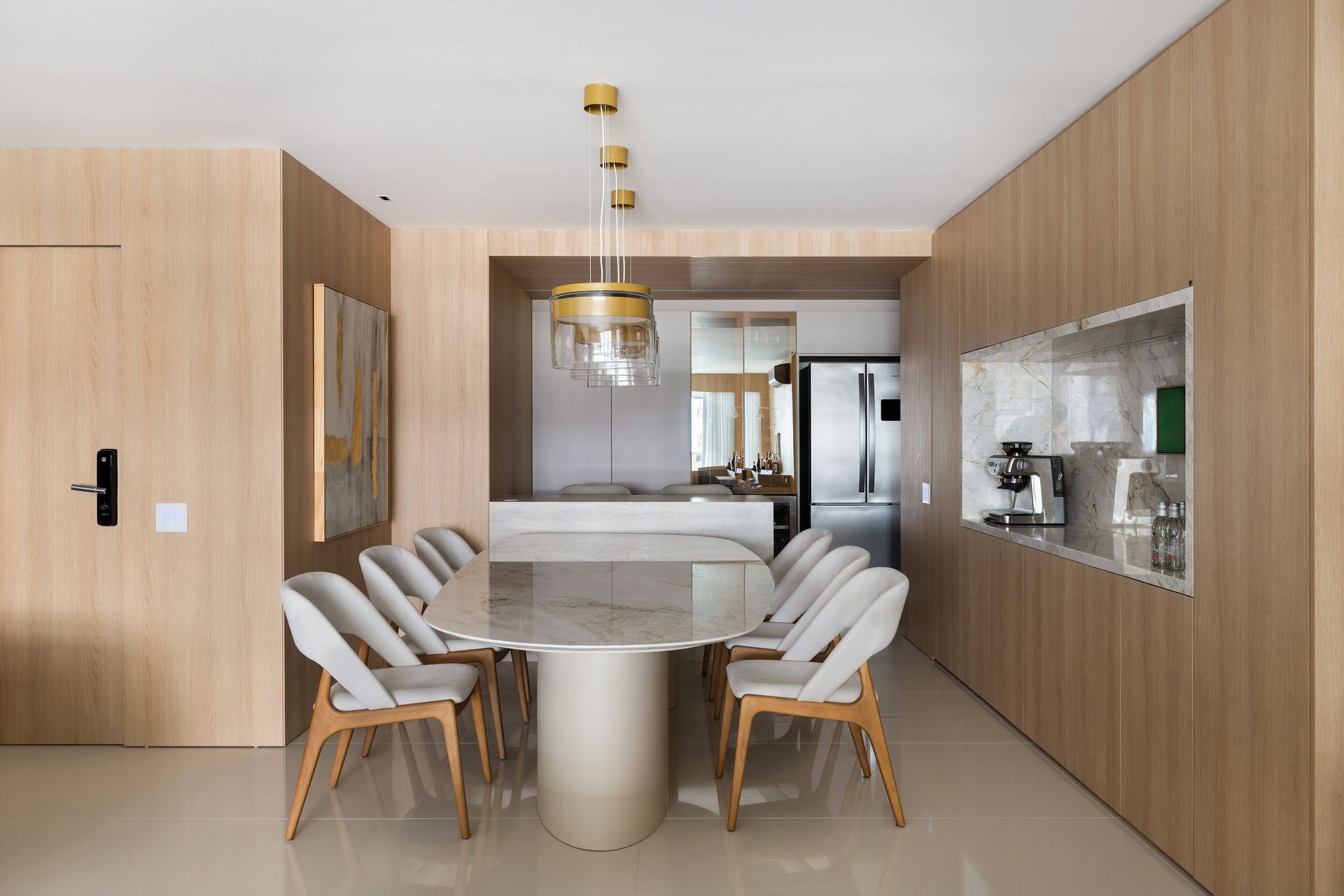 Com um layout milimetricamente planejado, o apartamento valoriza o fluxo interno, respeitando as conexões entre convívio e privacidade. Assim, a área social foi configurada de modo que a cozinha se conecta à sala de jantar, que, por sua vez, transita naturalmente ao living e à área gourmet, criando um eixo de convivência contínuo.