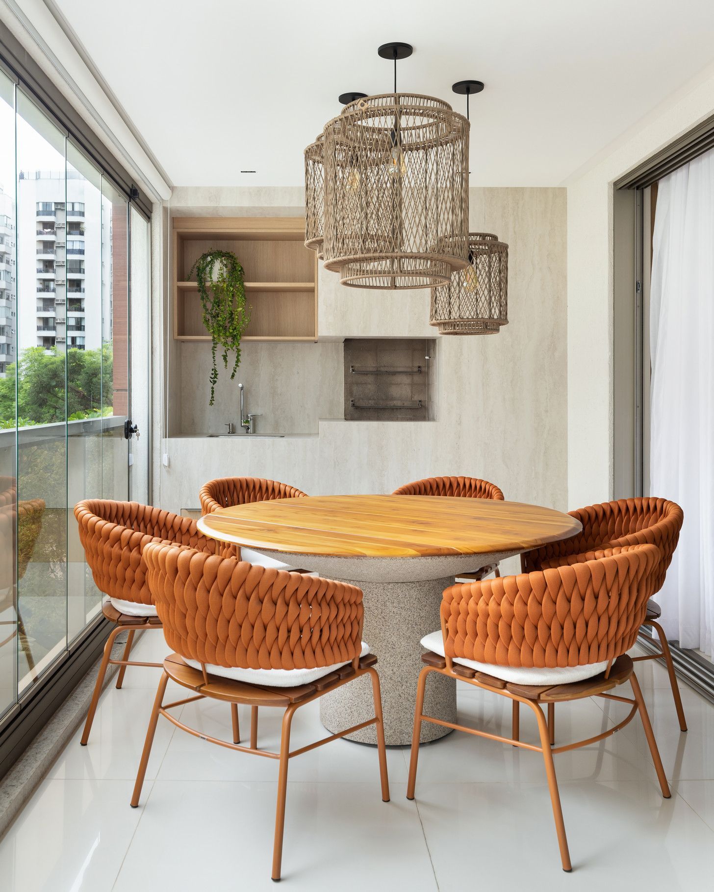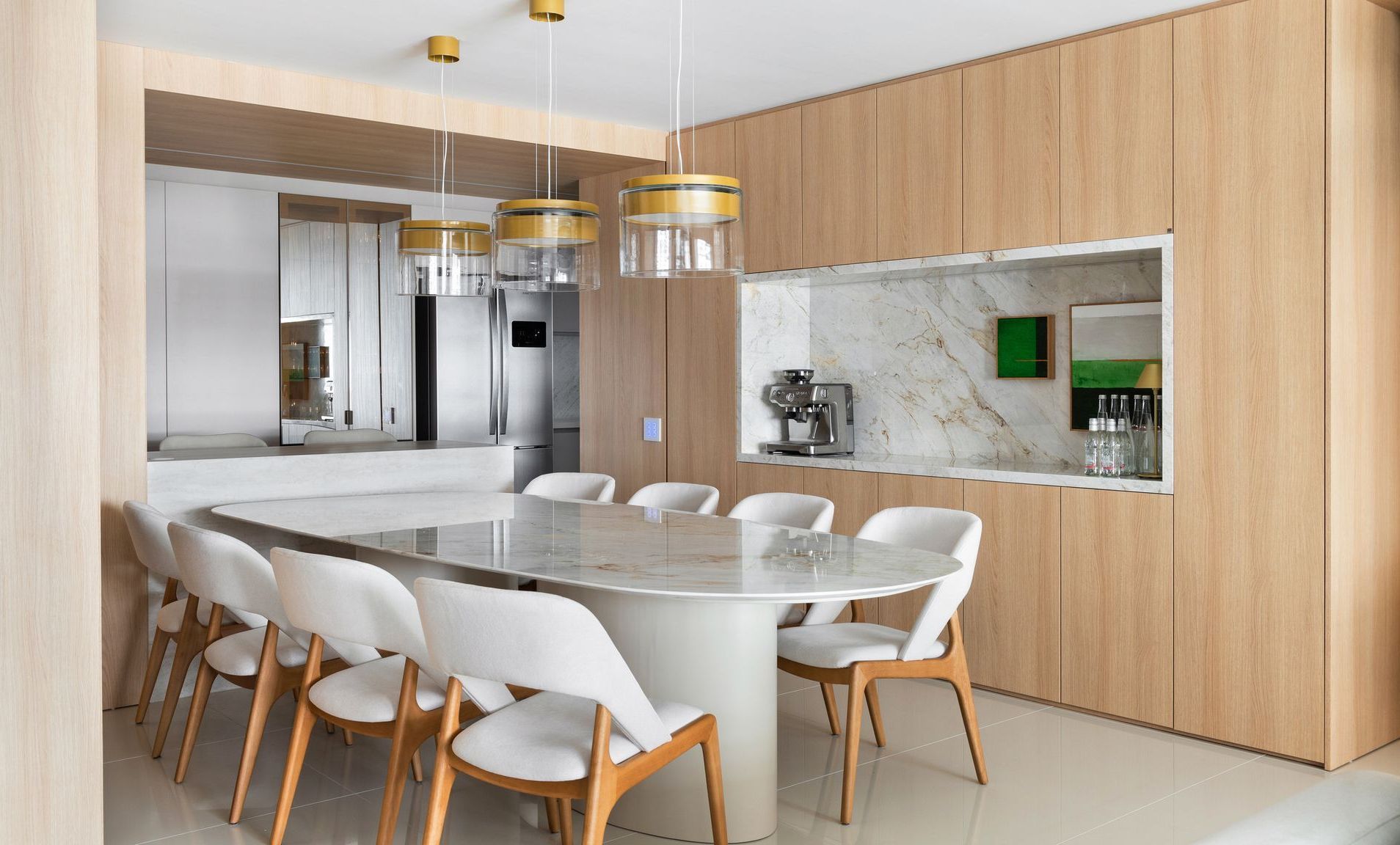 Na sala de jantar, o ponto focal é a imponente Mesa Seixo, assinada por Deivid de Almeida, com forma fluida e orgânica. Ali, as cadeiras Paola, criação de Ibanez Razzera, imprimem elegância e adicionam um toque contemporâneo e convidativo ao ambiente. No espaço gourmet, uma convivência harmoniosa entre materiais destaca a Mesa de Jantar Tempo, de Victor Leite, com base de cristal Veneza e tampo em madeira Teca, reforçando a narrativa de naturalidade do projeto.