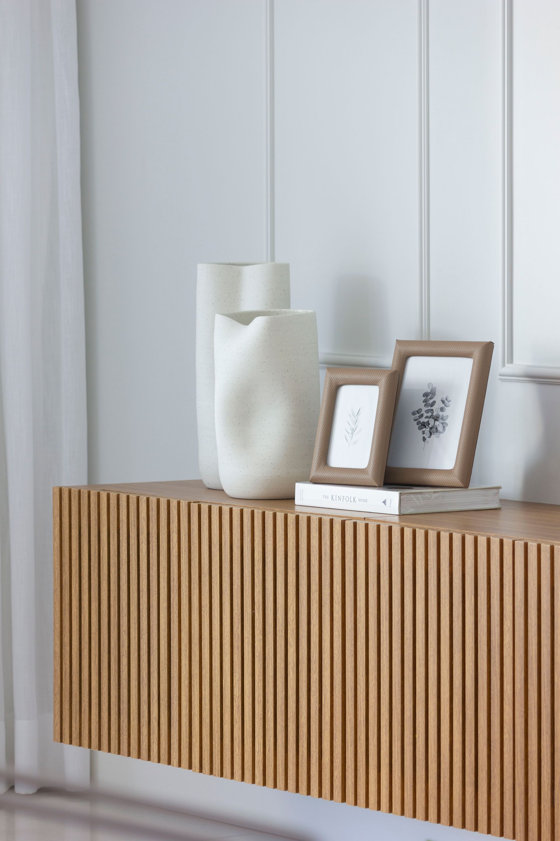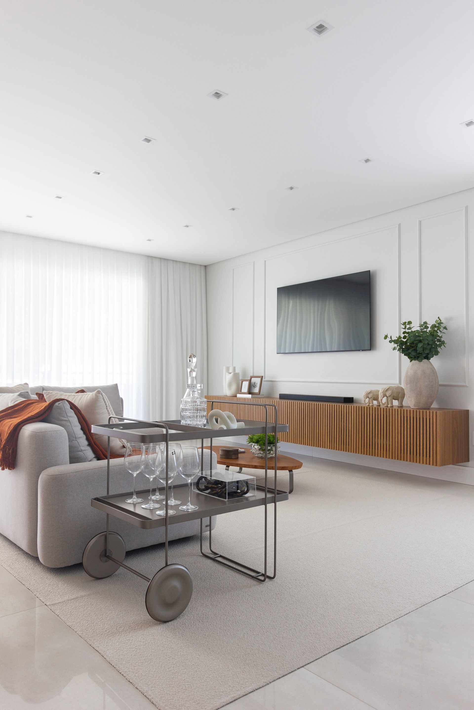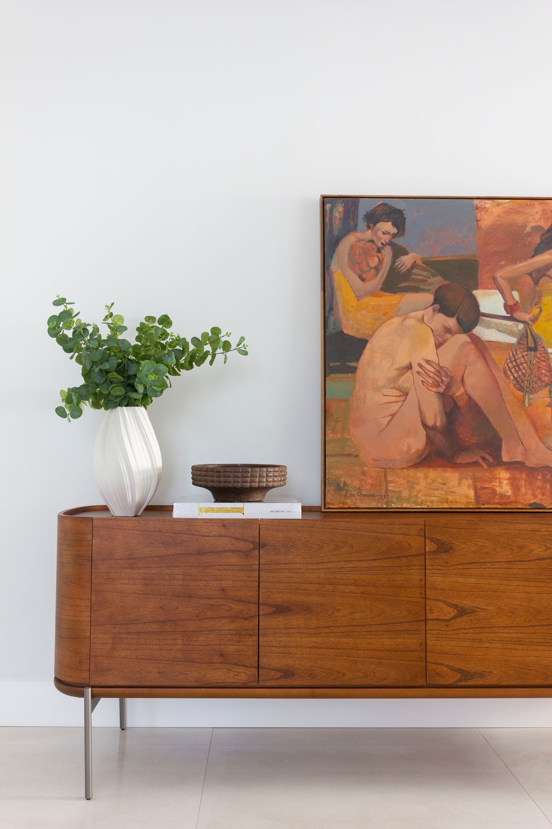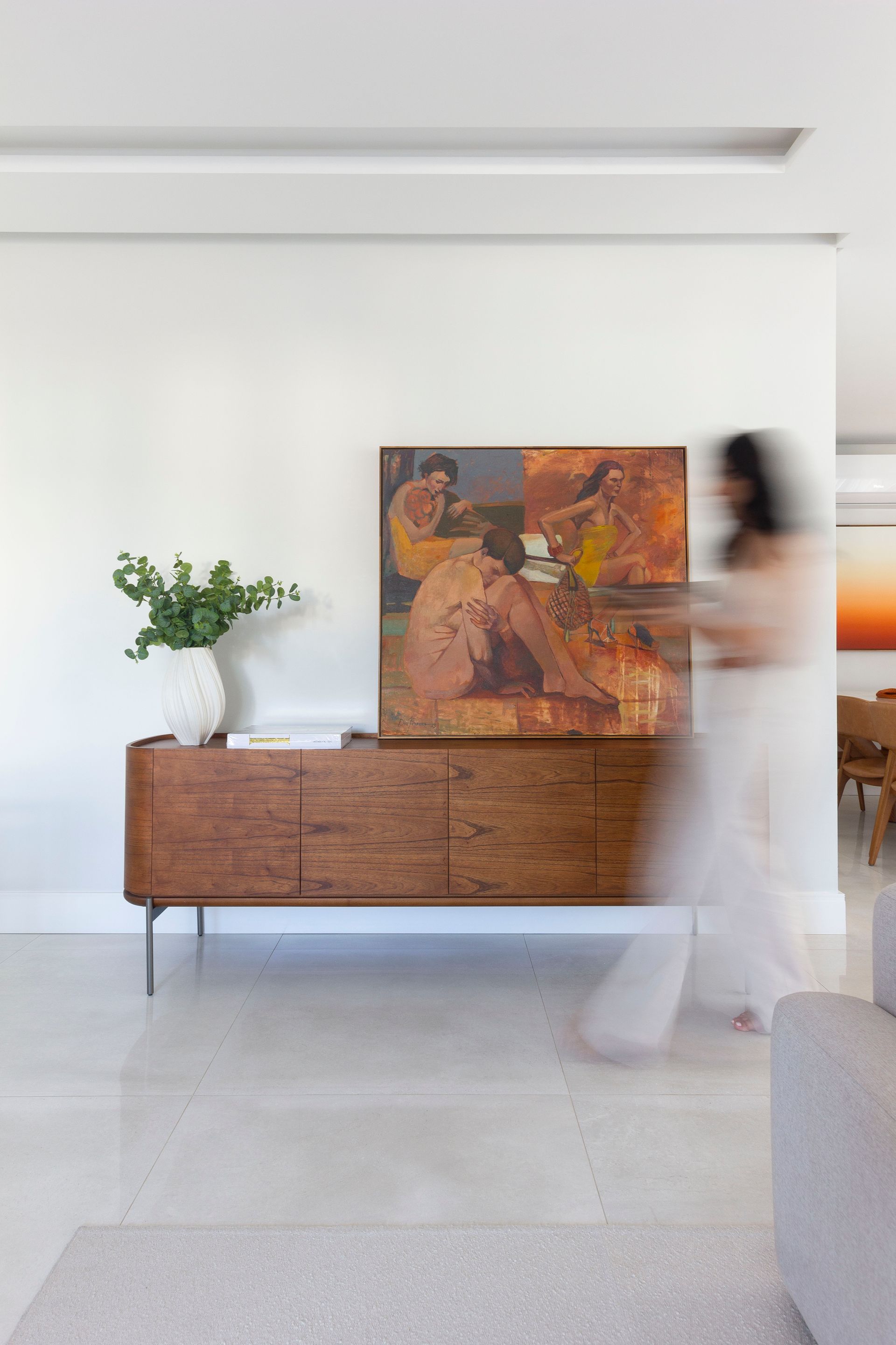 buffet Tamboré, da Asa Design, assume papel estratégico ao receber, logo na entrada, objetos usuais dos moradores e sustentar peças de arte que modulam o ambiente. A