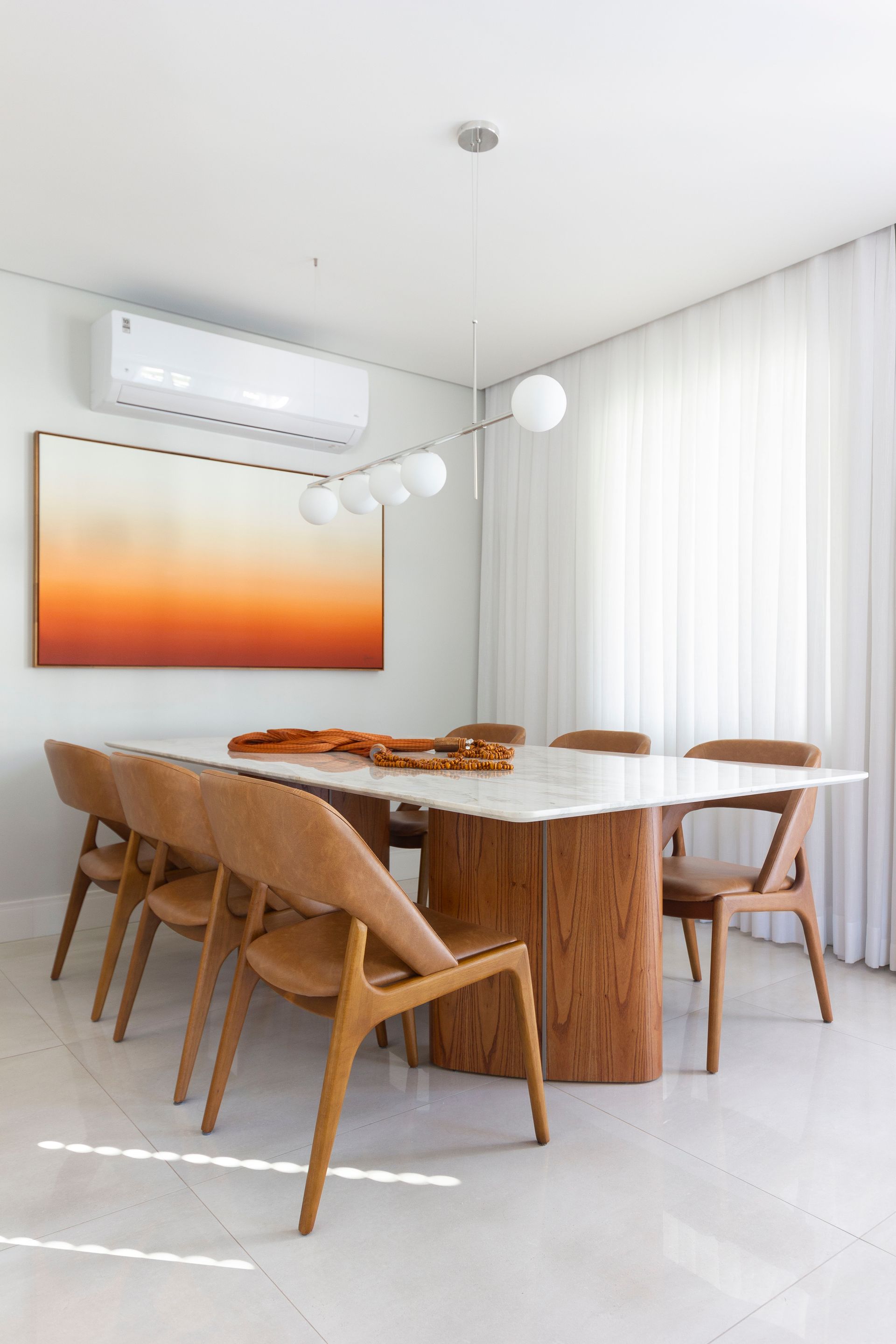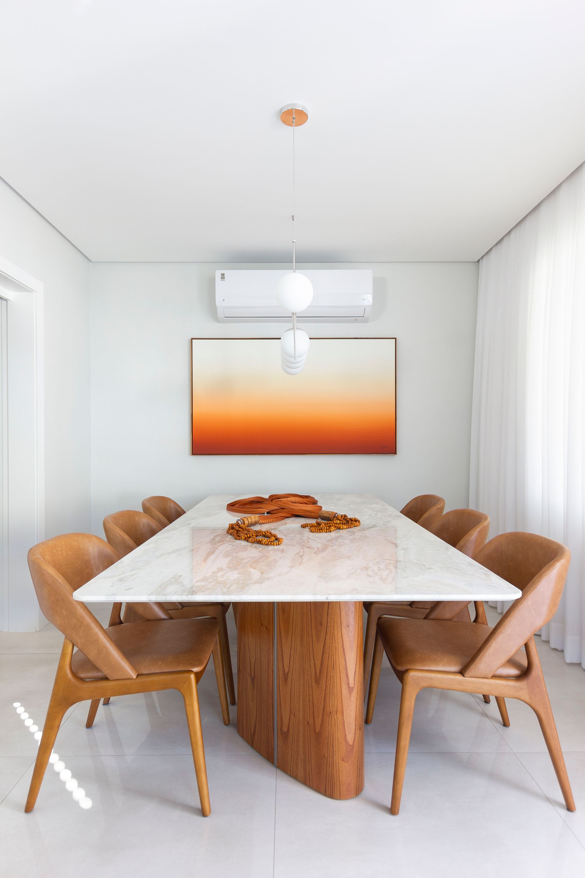 mesa de jantar Oblíqua, criação do estúdio Dua.Dsg, ancorada pelo tampo de mármore que harmoniza com a pedra já presente na escada original da residência. O
