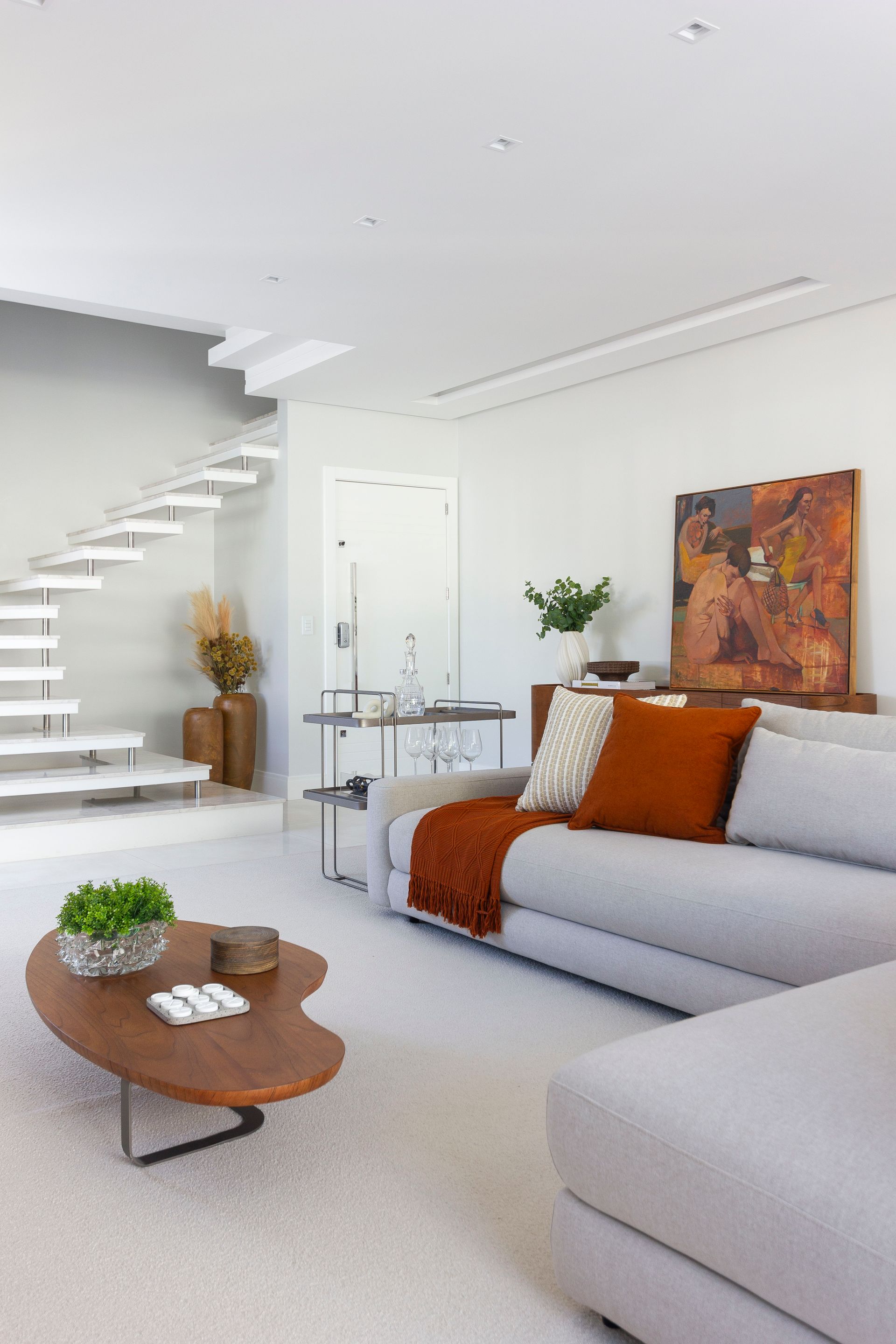 Essas escolhas dialogam de maneira delicada com os elementos já existentes—em especial a escada, esculpida em mármore, cuja presença foi suavemente replicada no tampo da mesa de jantar. A madeira, incorporada nos pés dos móveis, no aparador e na marcenaria do home de TV, atua como elemento de transição, aquecendo a paleta predominantemente cinza do imóvel. “Apostamos em materiais que pudessem, ao mesmo tempo, remeter à natureza ao redor e trazer conforto sensorial para dentro de casa”, observa Isabela.