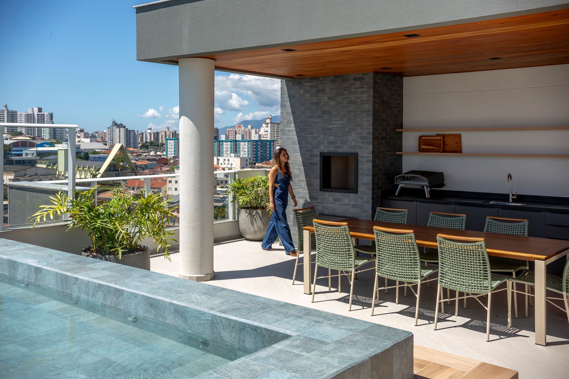 No La Spezia, o rooftop assume papel central na vida do condomínio. Piscinas, áreas gourmet, lounges e espaços de descanso se articulam como uma praça elevada, pensada para o uso diário. O mobiliário da Contti contribui para essa leitura contínua, com peças como a espreguiçadeira Buriti, a mesa de jantar Allegra e a poltrona Cassis, distribuídas de forma a favorecer encontros informais e a convivência prolongada, sempre em diálogo com a paisagem da cidade.