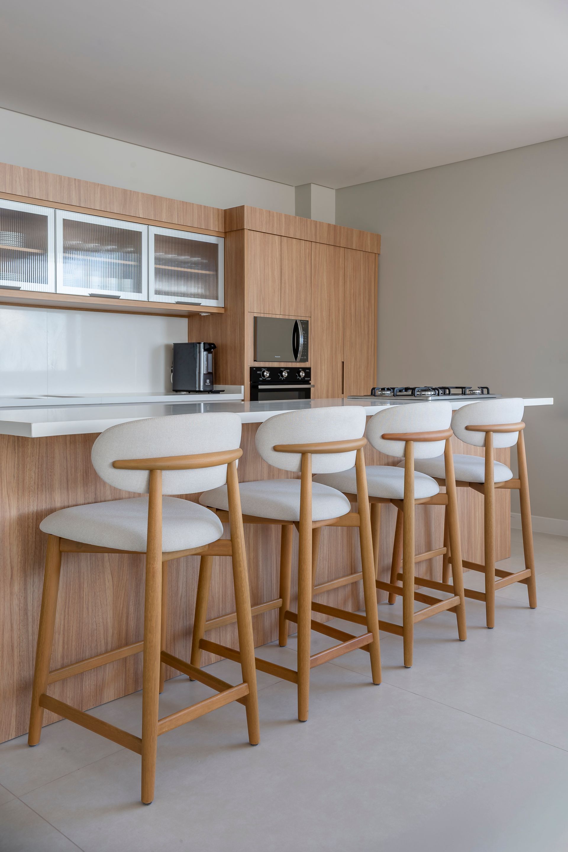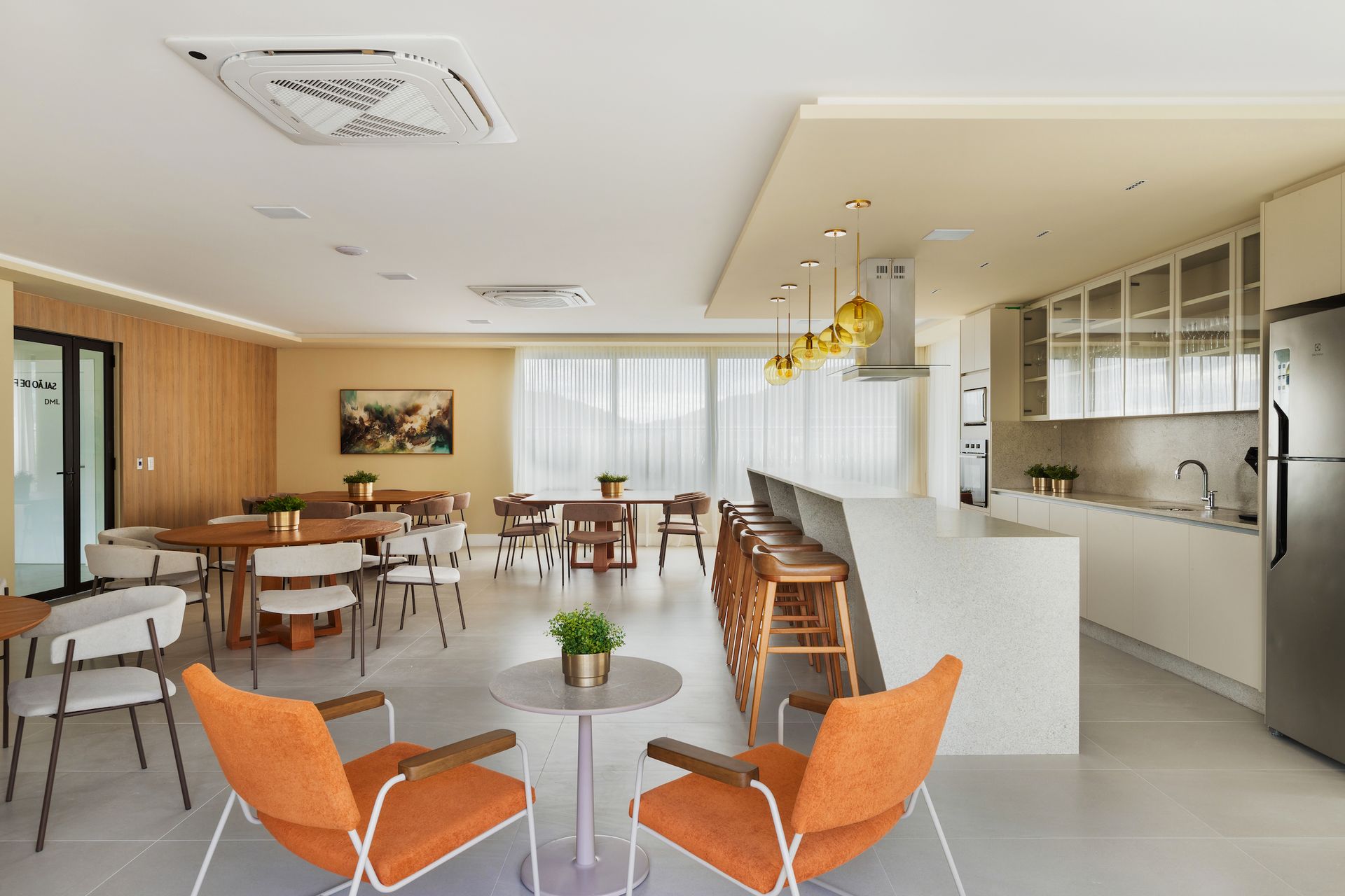 Implantado ao longo da SC-401, o First propõe áreas comuns que acompanham os novos ritmos da cidade. Boulevard, café, espaço gourmet e cobertura com terraço, sky bar e piscina funcionam como ambientes híbridos, onde trabalhar, encontrar e descansar coexistem. O uso das peças Contti reforça a unidade do projeto, com peças como o sofá Carmel, a poltrona Breeze, de Maurício Bomfim, e a mesa Uni, que sustentam diferentes usos e ampliam o tempo de permanência nos espaços compartilhados. [Foto: Rafael Ribeiro]