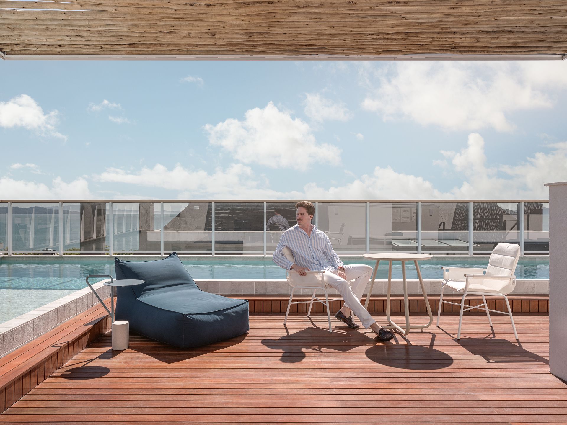 No Mirá, as áreas coletivas foram desenhadas com a mesma atenção dedicada aos interiores dos apartamentos. A proposta parte da ideia de uso cotidiano, com layouts flexíveis e relação constante com a paisagem. O mobiliário da Contti atua como elemento organizador do espaço, com sofás modulares, mesas de centro e espreguiçadeiras que permitem rearranjos frequentes, estimulando encontros espontâneos e diferentes formas de permanência ao longo do dia. [Foto: Luma Reimann]