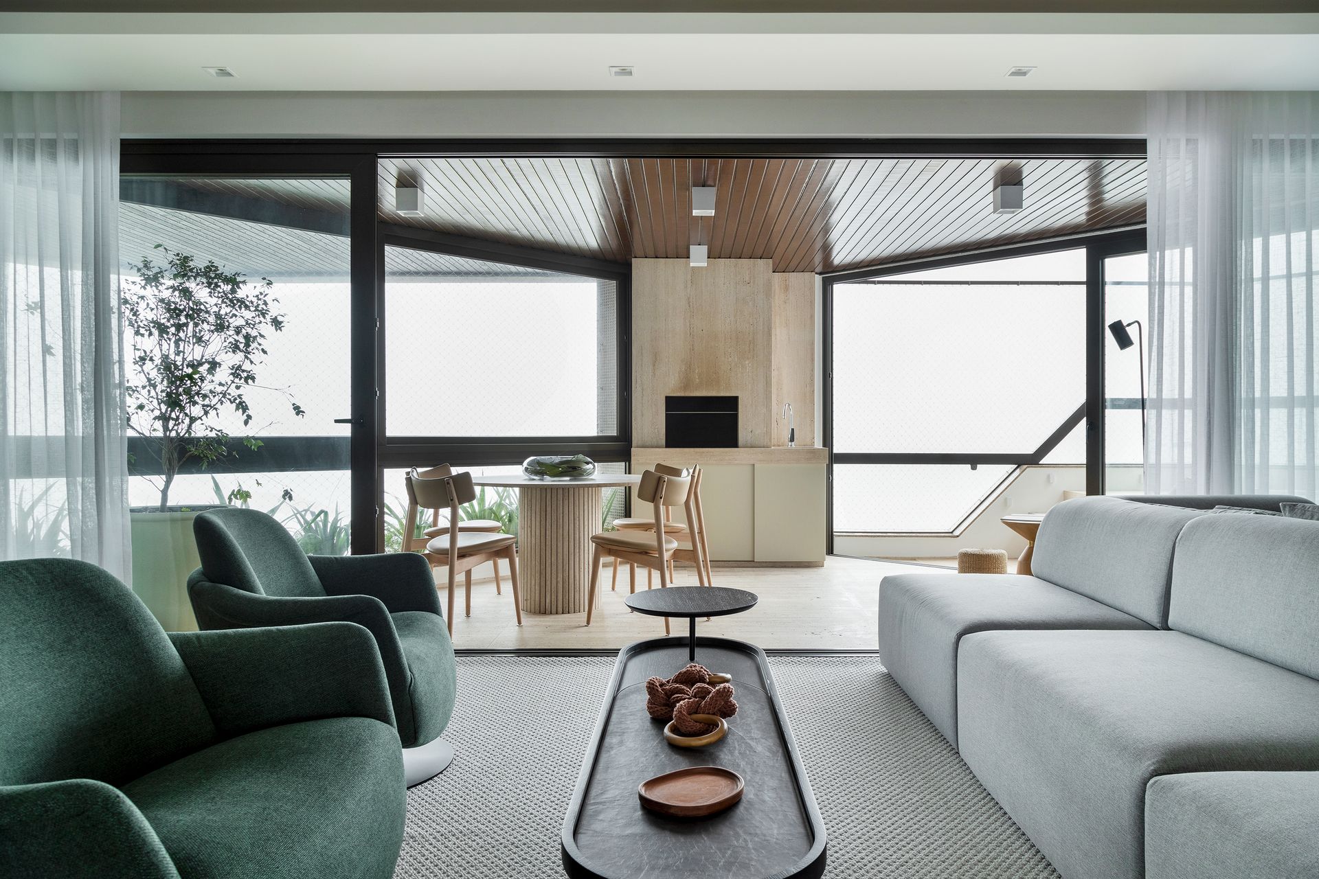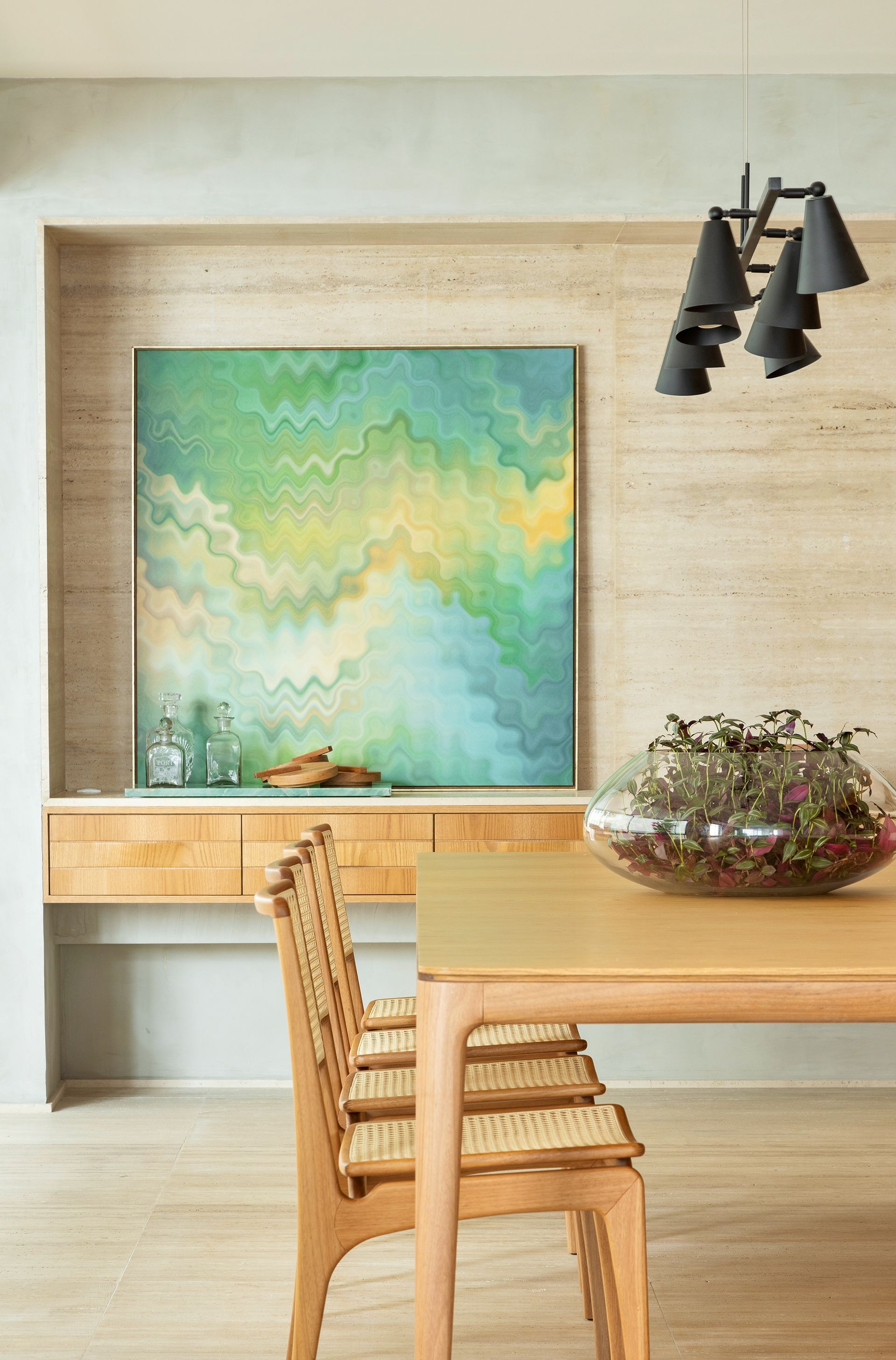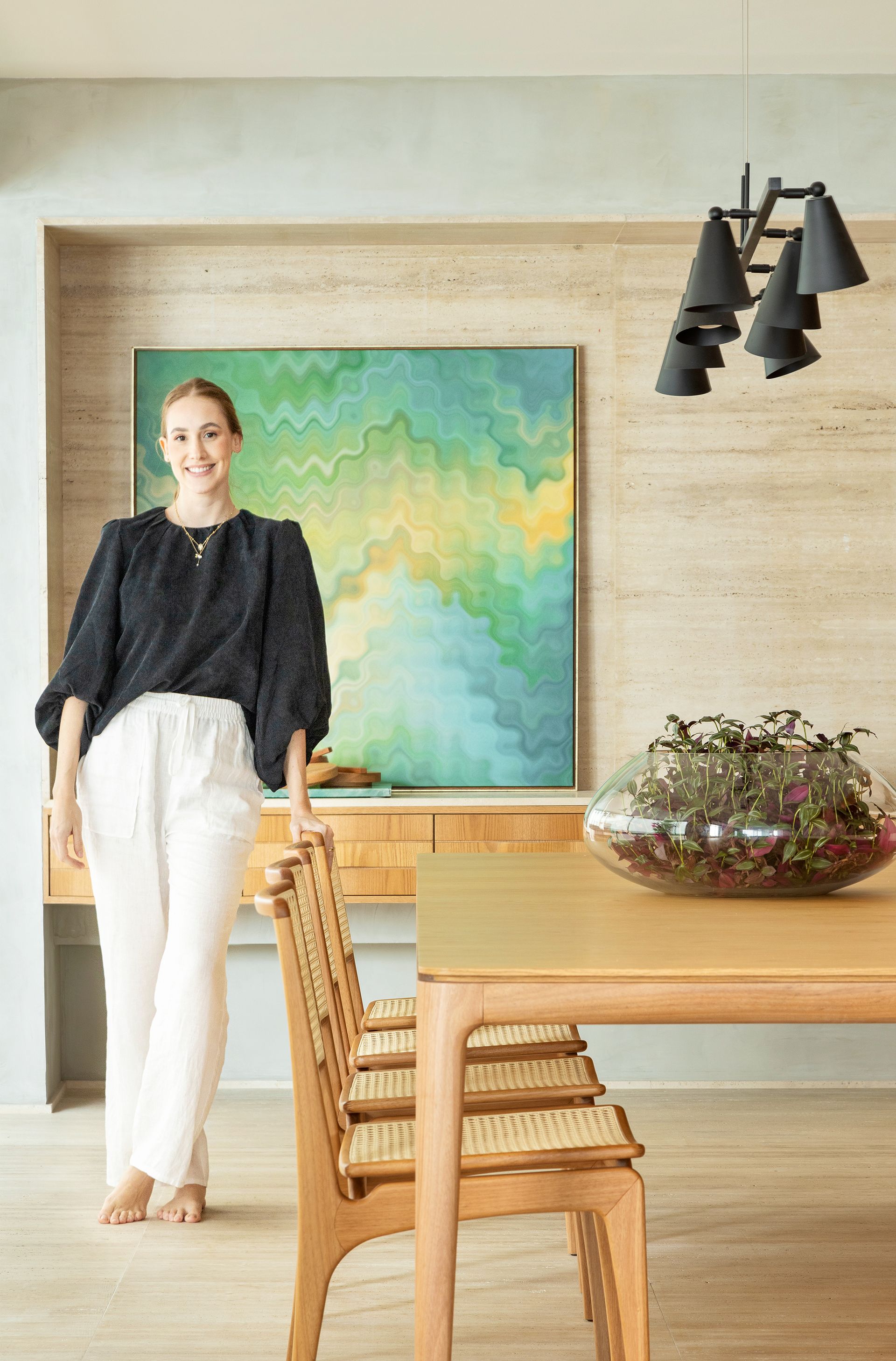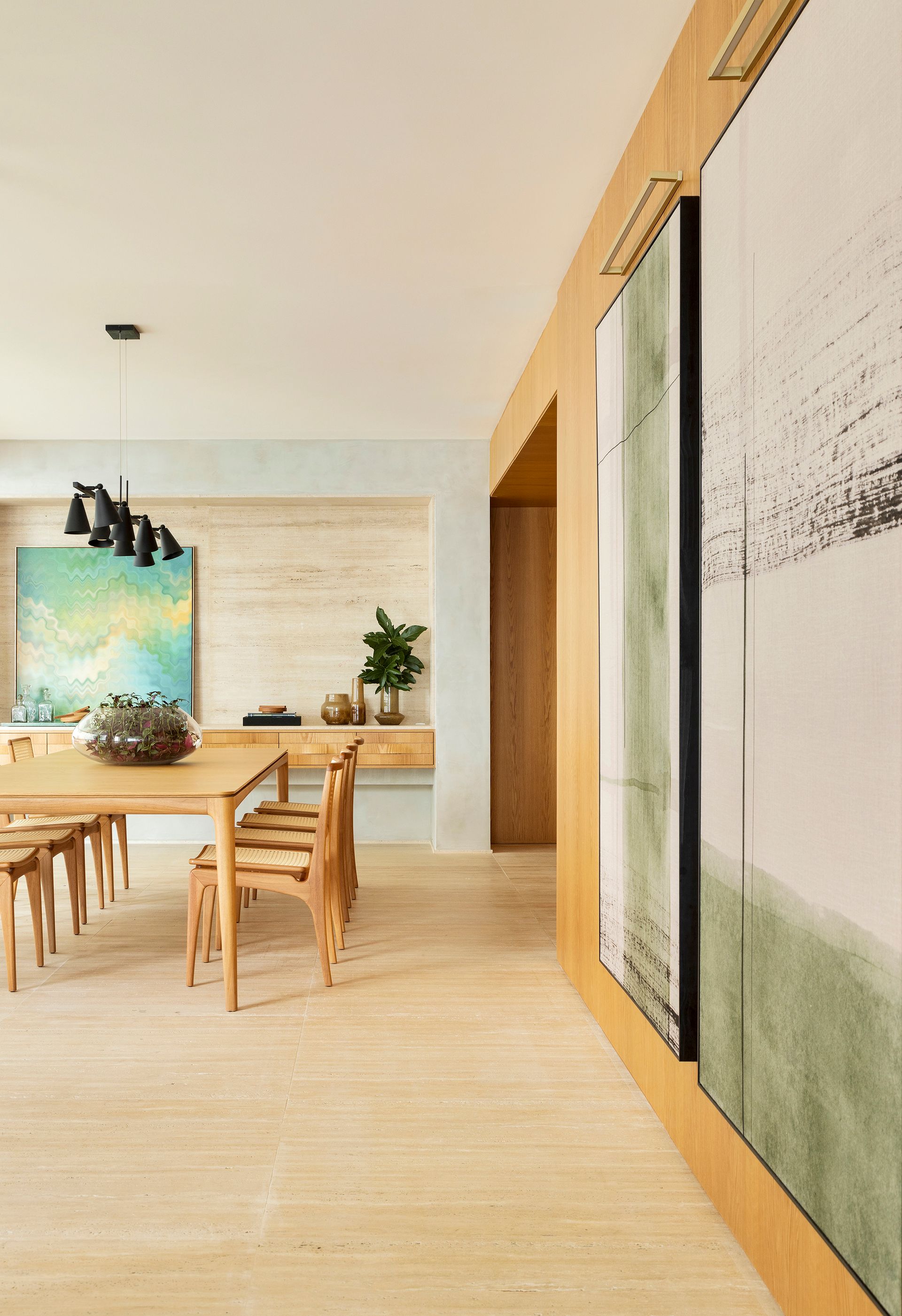 O paisagismo trouxe pitadas de natureza aos espaços internos, enquanto um pórtico abraça a sala de jantar. Uma paleta de cores sóbrias e amadeirados nas paredes e móveis unificou as áreas de lazer e convívio. O decór ganhou ainda o toque singular das telas de Camila Saavedra. As obras de arte em aquarela adicionam delicadeza e ludicidade a este refúgio privado e acolhedor.