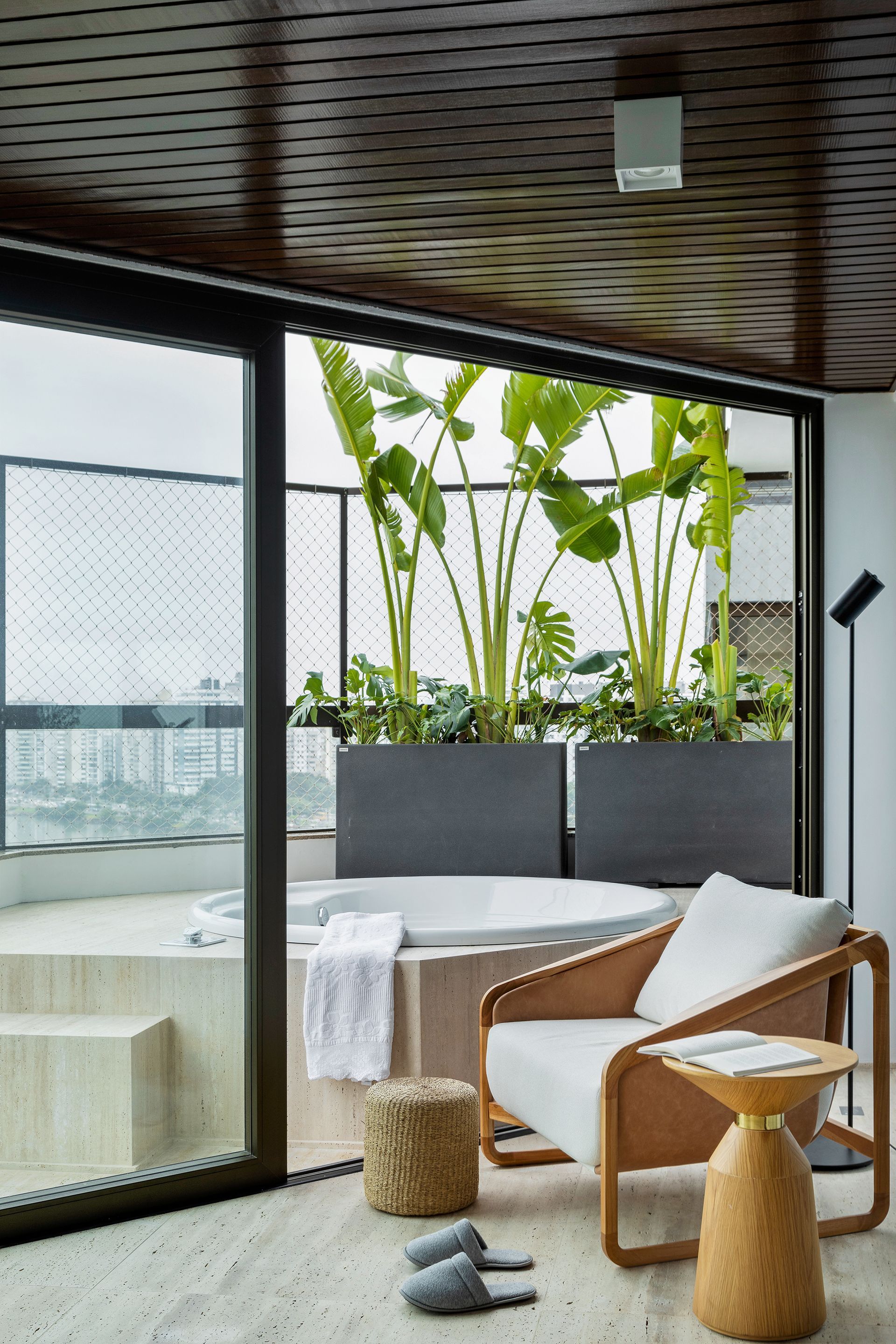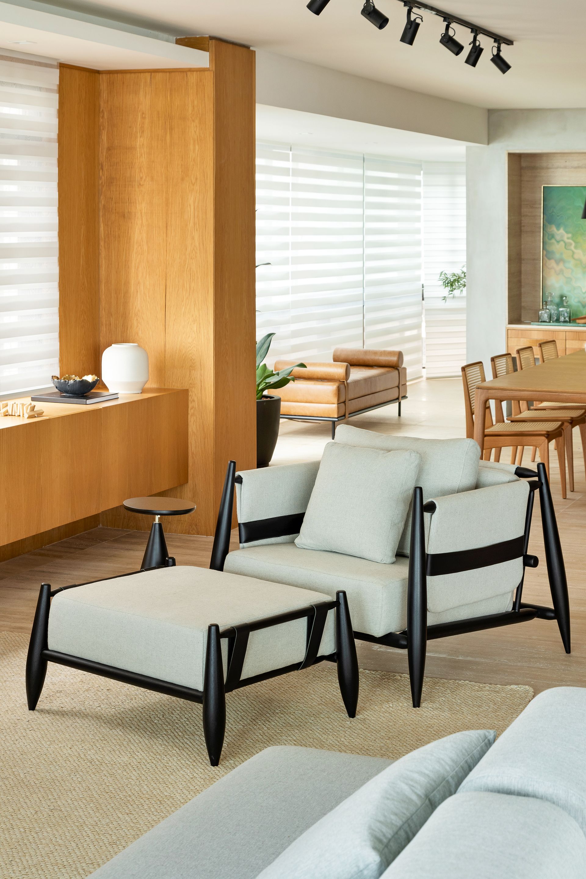 Próxima à parede revestida em carvalho, uma dupla super especial compõe o cantinho de leitura. São a poltrona Era (Contti), de madeira tauari ebanizada, em conjunto com o puff, ambos desenhados por Edu Bortolai. Aqui até a incidência de luz natural é favorável a quem queira desfrutar de um bom livro.