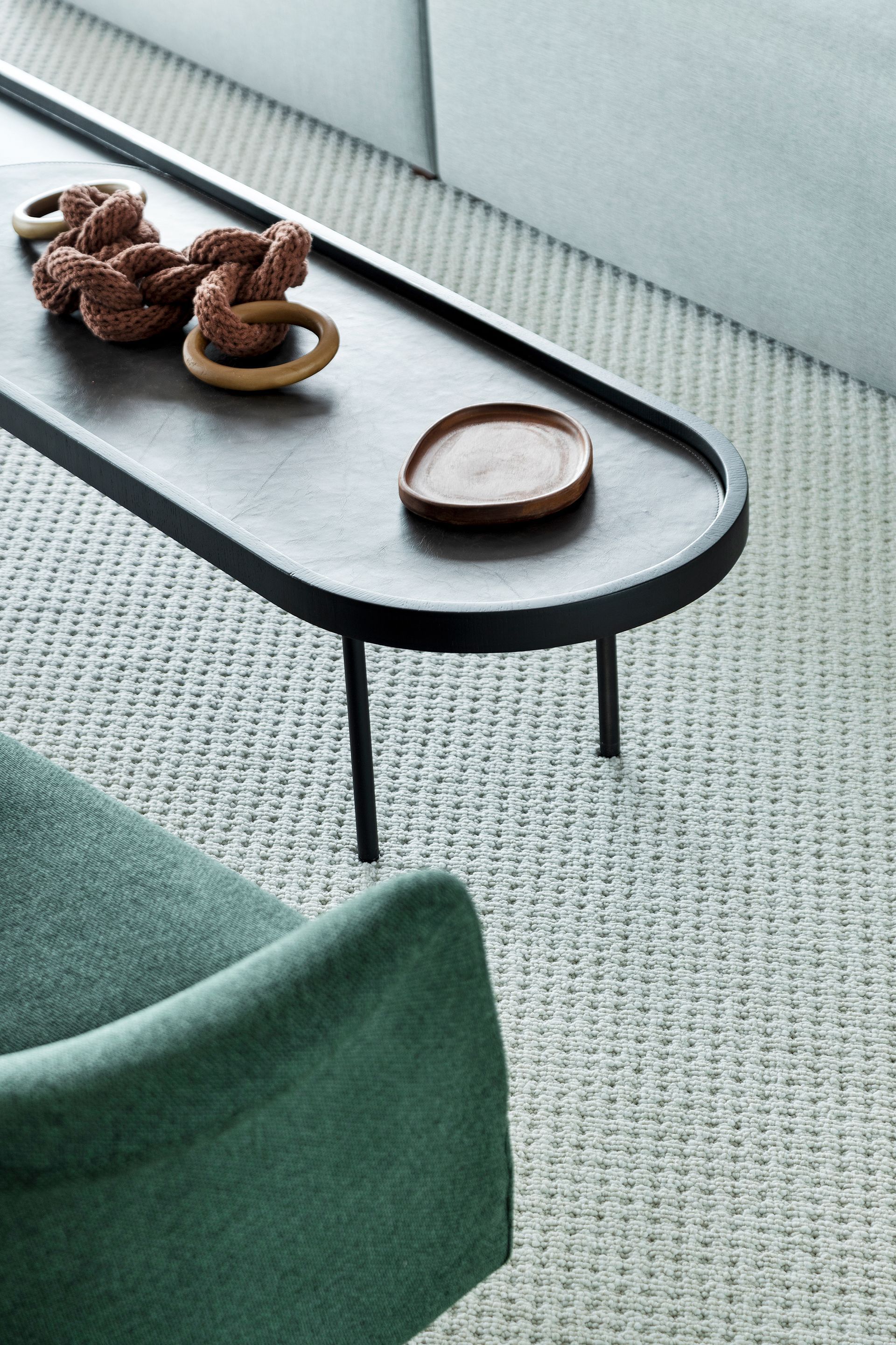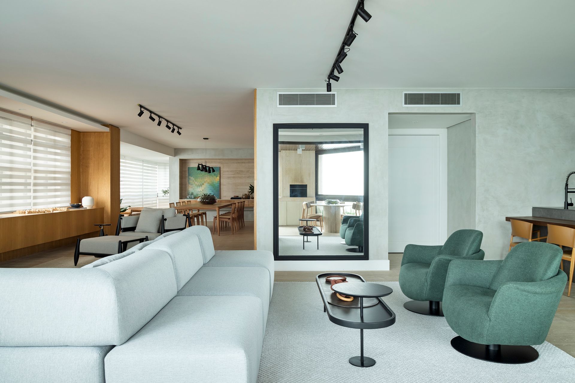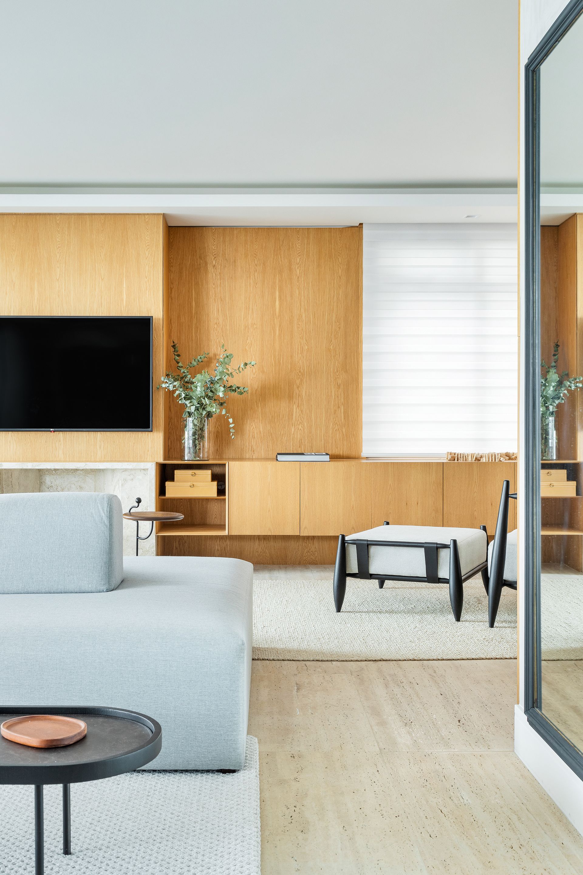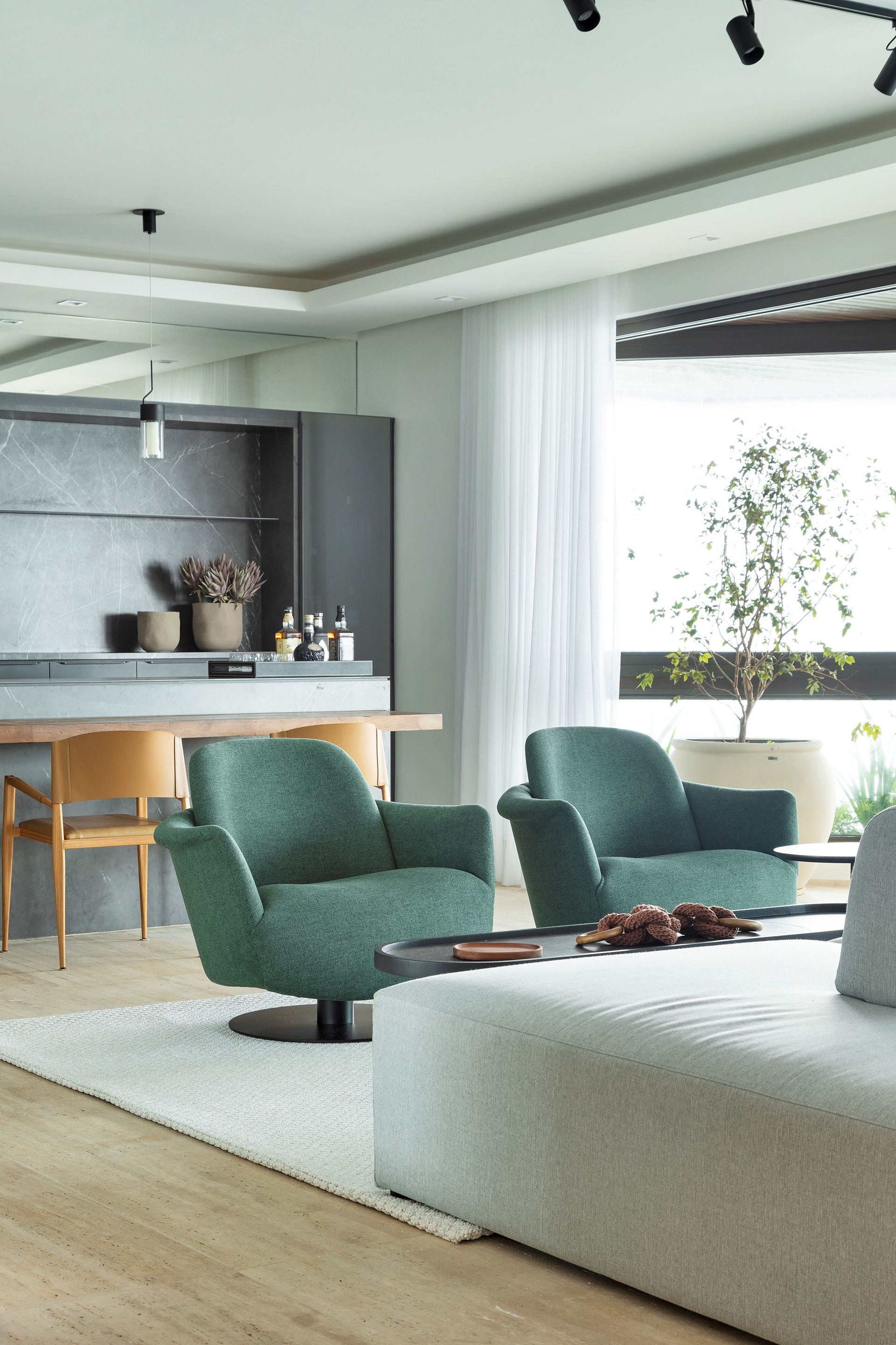 A busca por aconchego se estendeu ao interior do apartamento. O piso foi completamente substituído, conferindo uma textura agradável e calorosa, ao contrário do anterior que era frio. Para mais comodidade no living, a arquiteta Gabriela sugeriu um sofá da Contti o Solano, bilateral e modular, feito sob medida para o espaço. “Este estofado inovador integra dois ambientes distintos - a sala de estar/TV e um ambiente voltado para o bar - em um design totalmente harmônico”, explica Zamparetti.