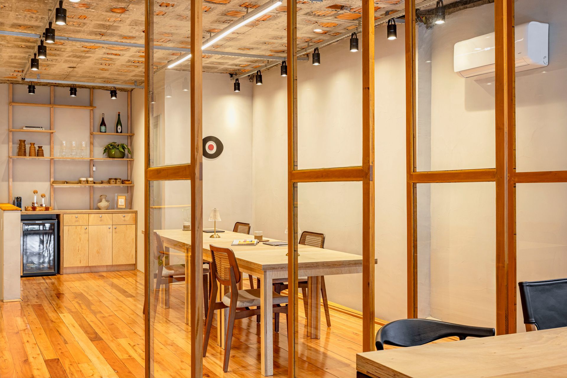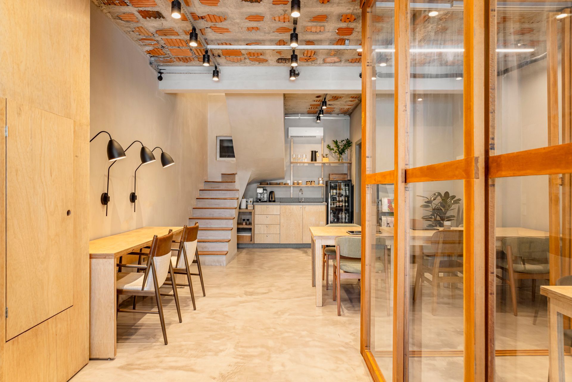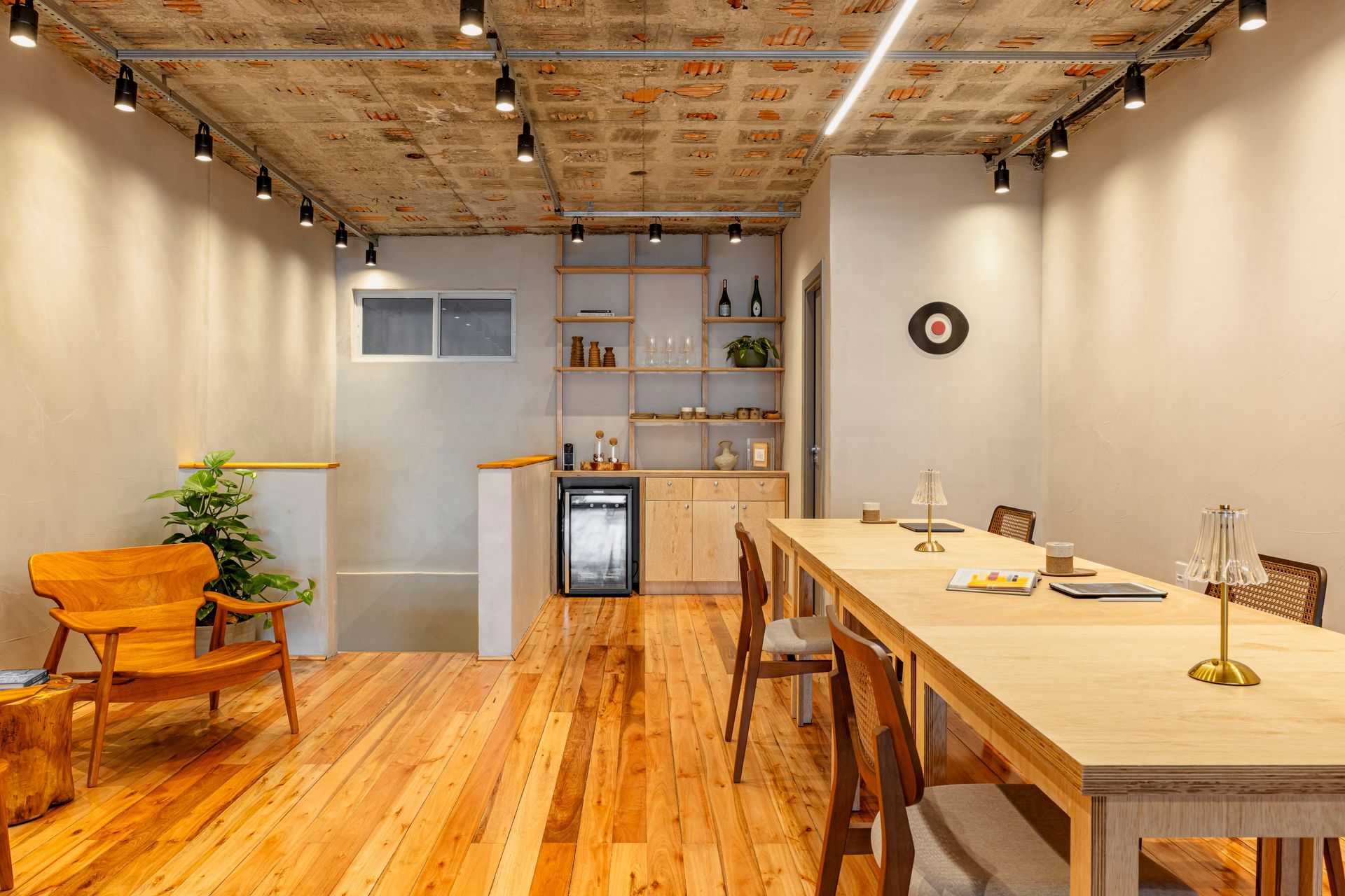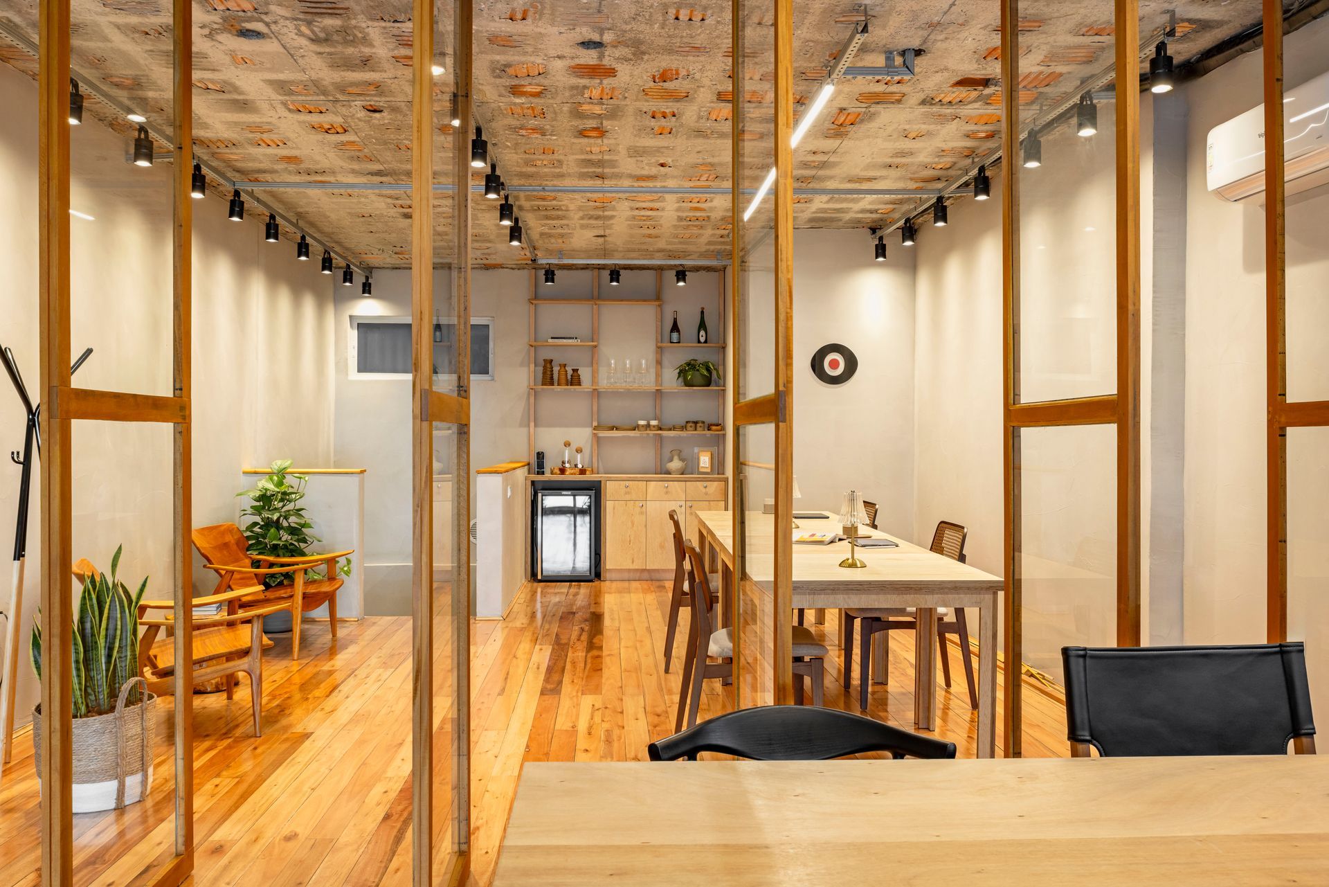 A planta foi desenhada para separar usos com clareza. No térreo, a área fica aberta ao público, com estações de trabalho e salas de reunião que podem ser alugadas, além de copa e lavabo compartilhados. No mezanino, o projeto se recolhe para o uso dos proprietários: um ambiente destinado à criação e encontros mais reservados, com área de descompressão, wine bar e lavabo exclusivo. Esquadrias de correr nas salas de reunião ajudam a regular a integração dos ambientes em dias de eventos, quando o espaço precisa ganhar continuidade.