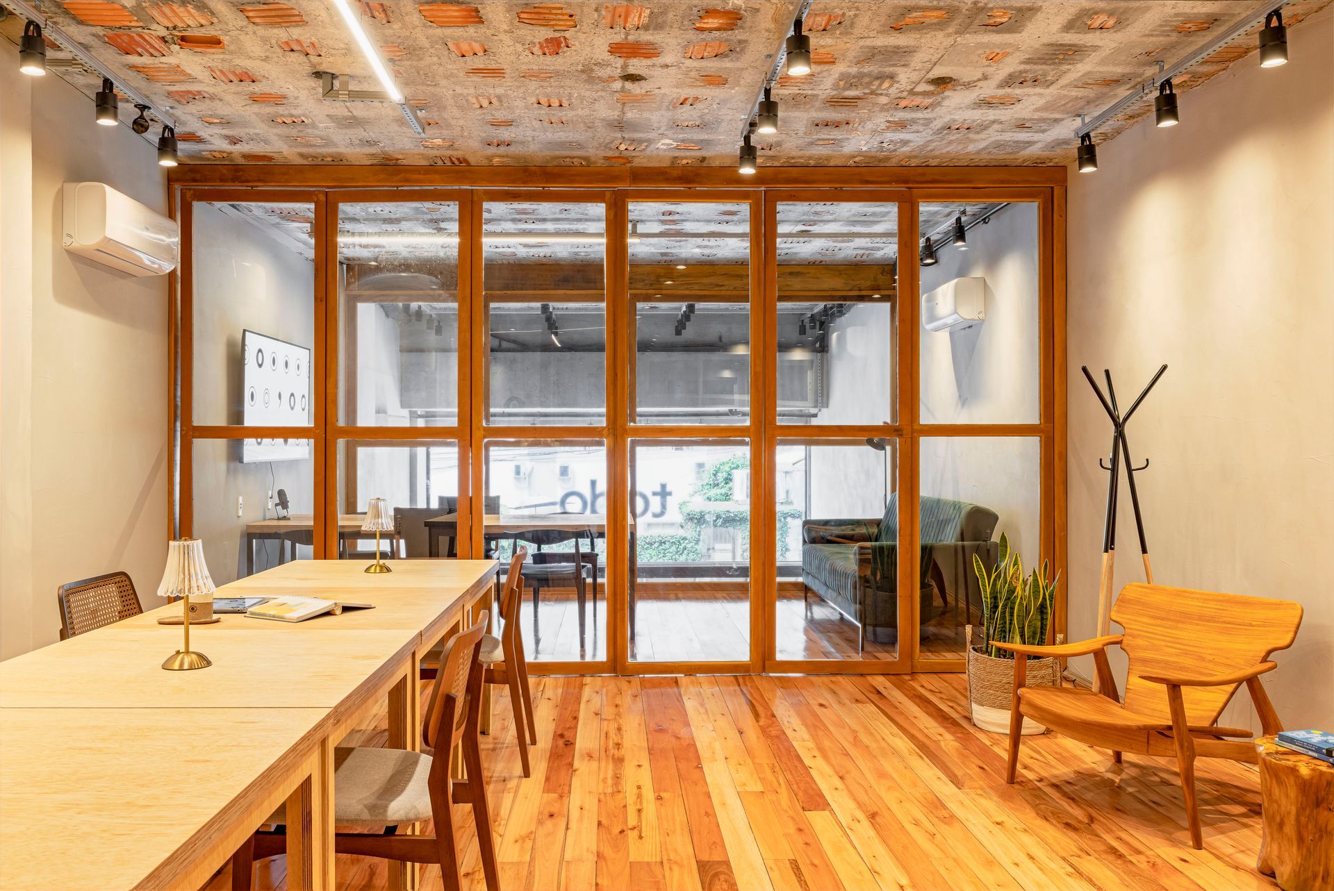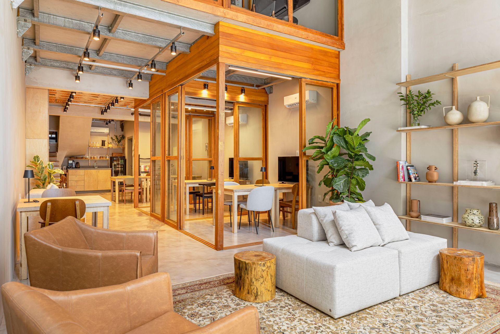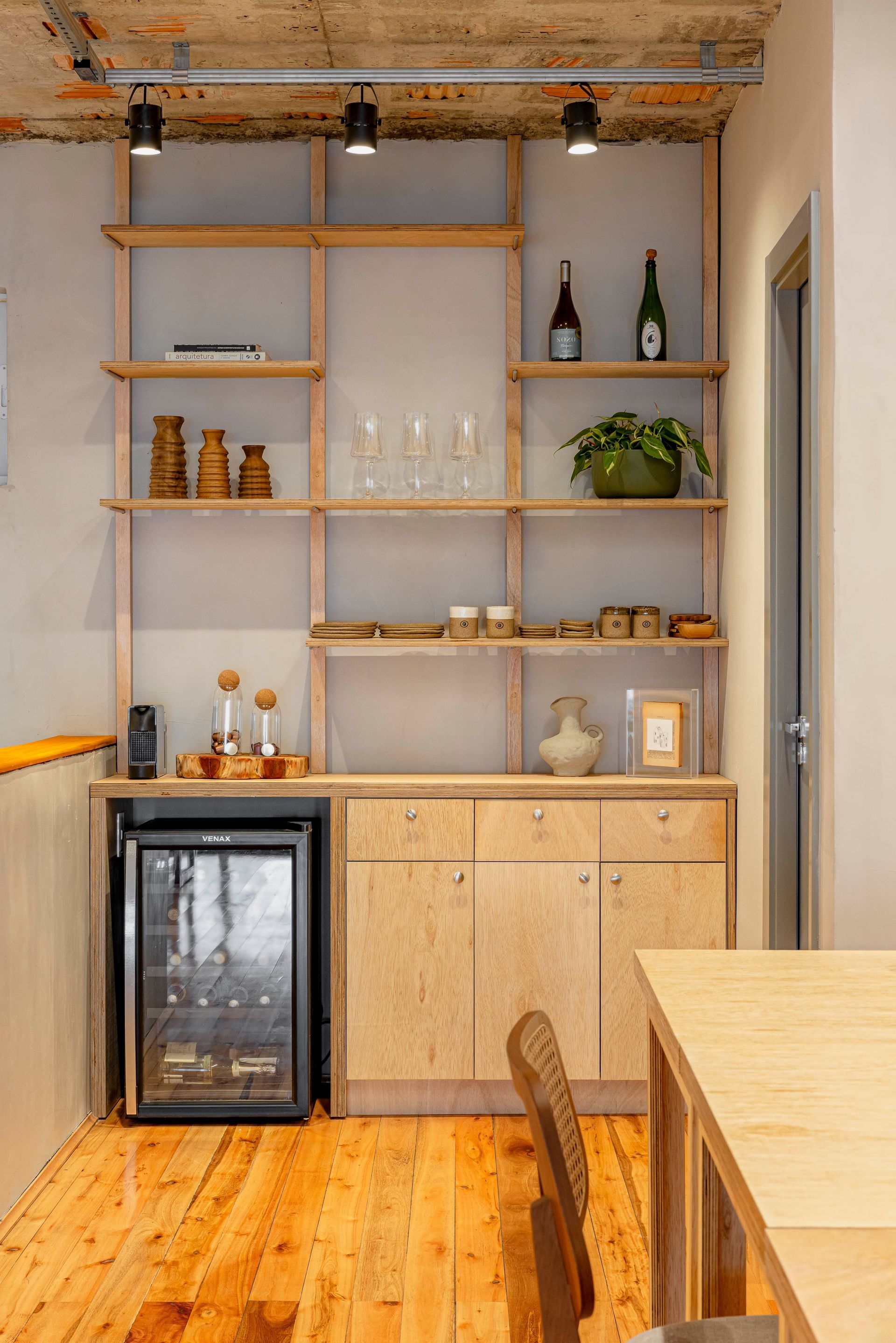 A planta foi desenhada para separar usos com clareza. No térreo, a área fica aberta ao público, com estações de trabalho e salas de reunião que podem ser alugadas, além de copa e lavabo compartilhados. No mezanino, o projeto se recolhe para o uso dos proprietários: um ambiente destinado à criação e encontros mais reservados, com área de descompressão, wine bar e lavabo exclusivo. Esquadrias de correr nas salas de reunião ajudam a regular a integração dos ambientes em dias de eventos, quando o espaço precisa ganhar continuidade.