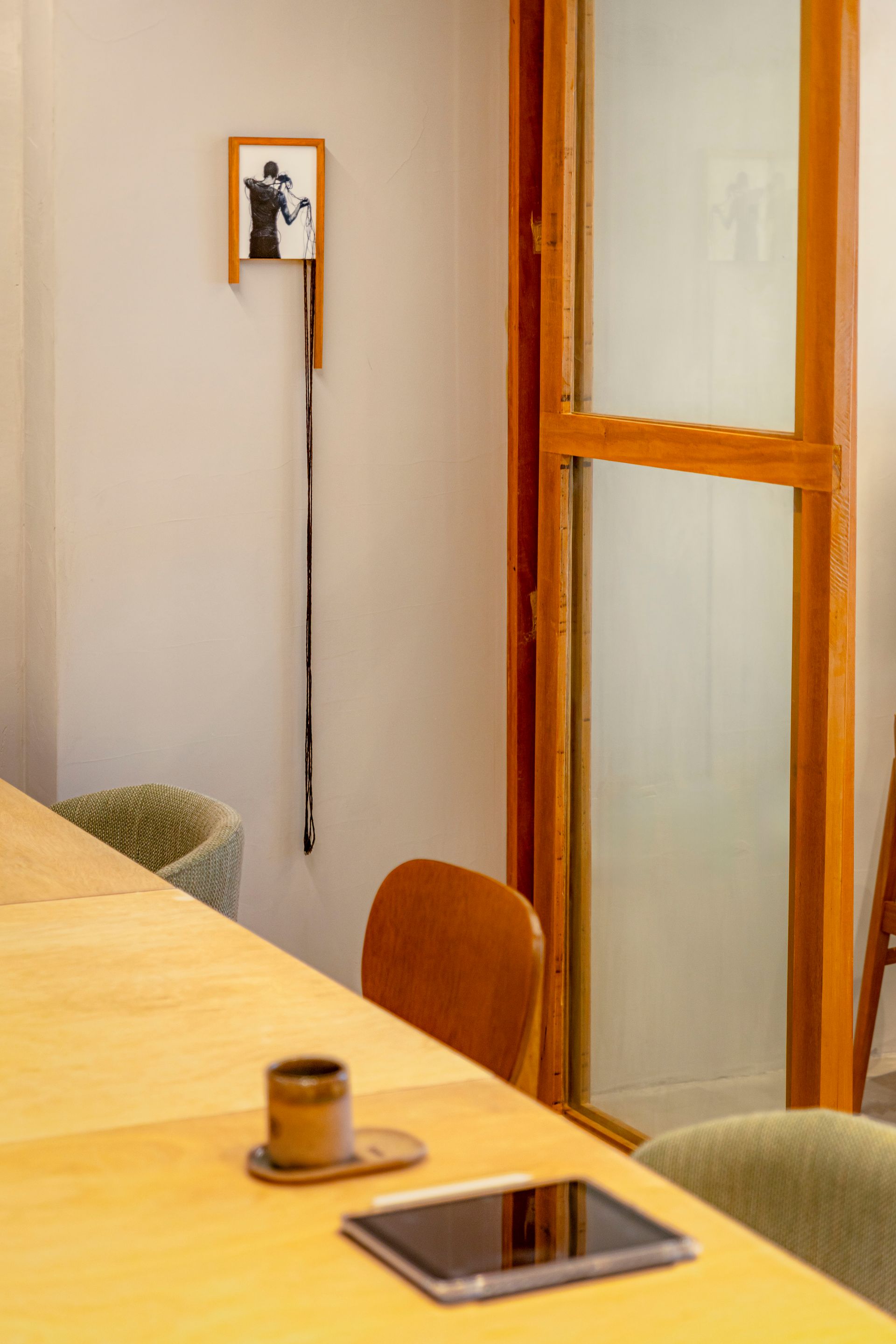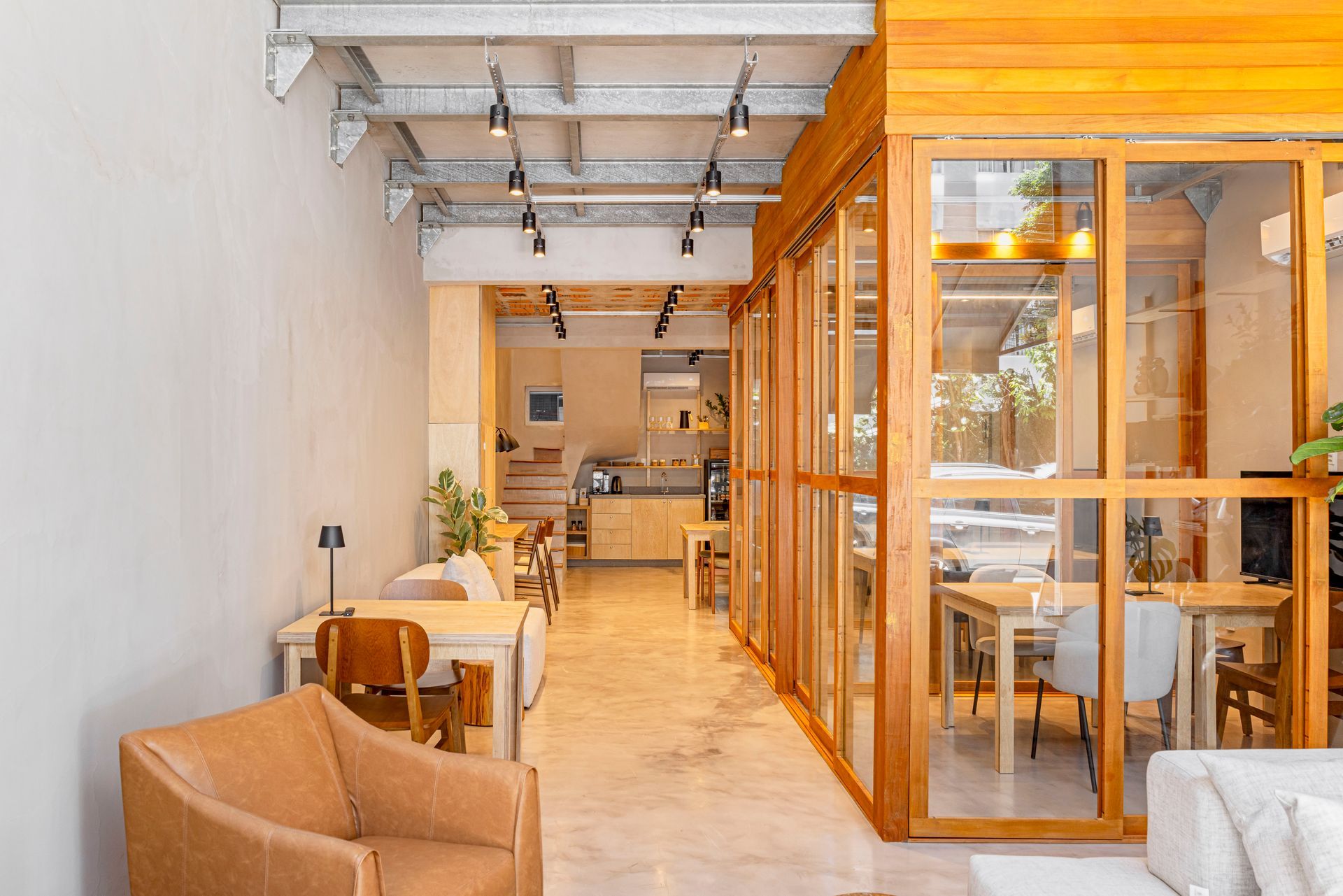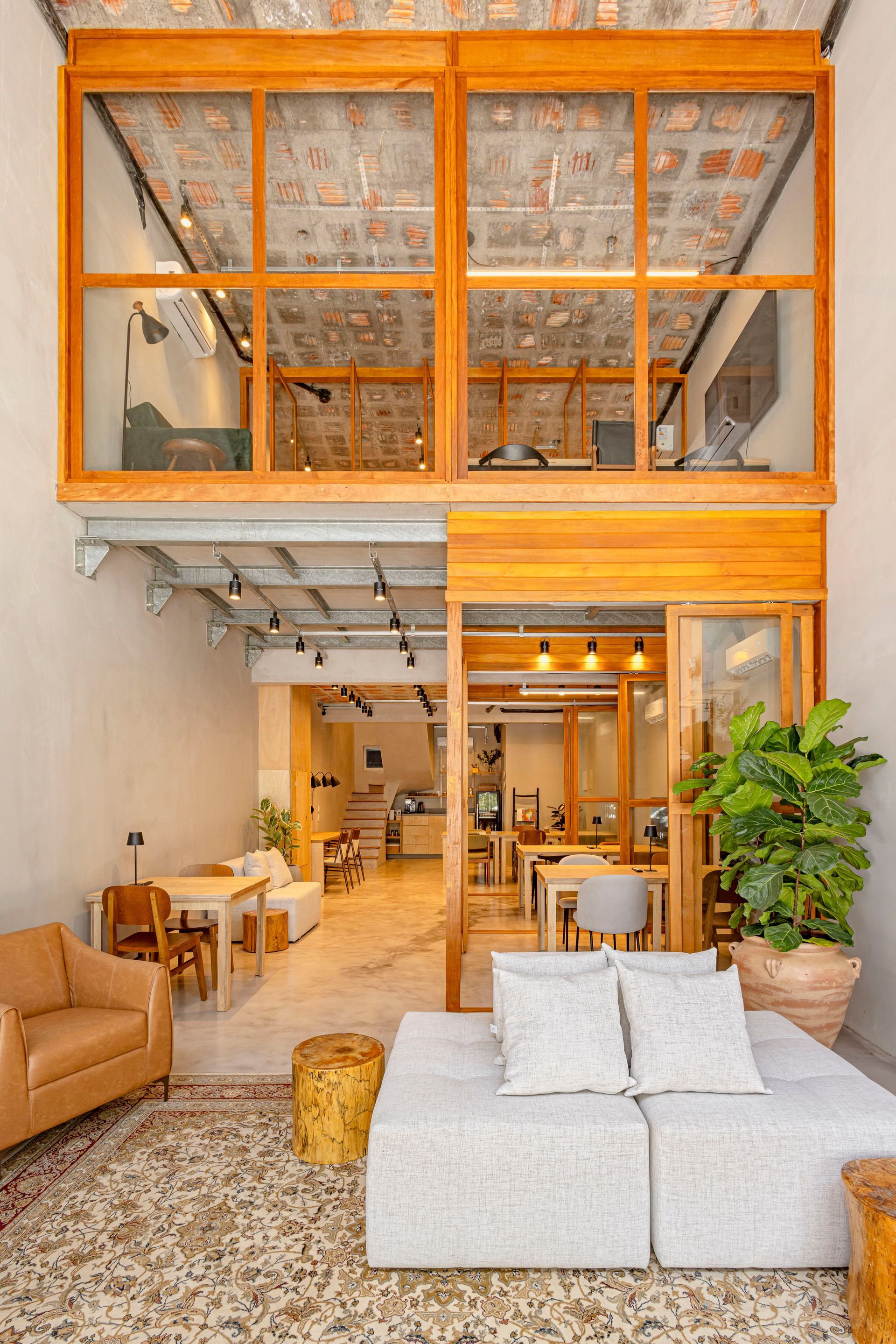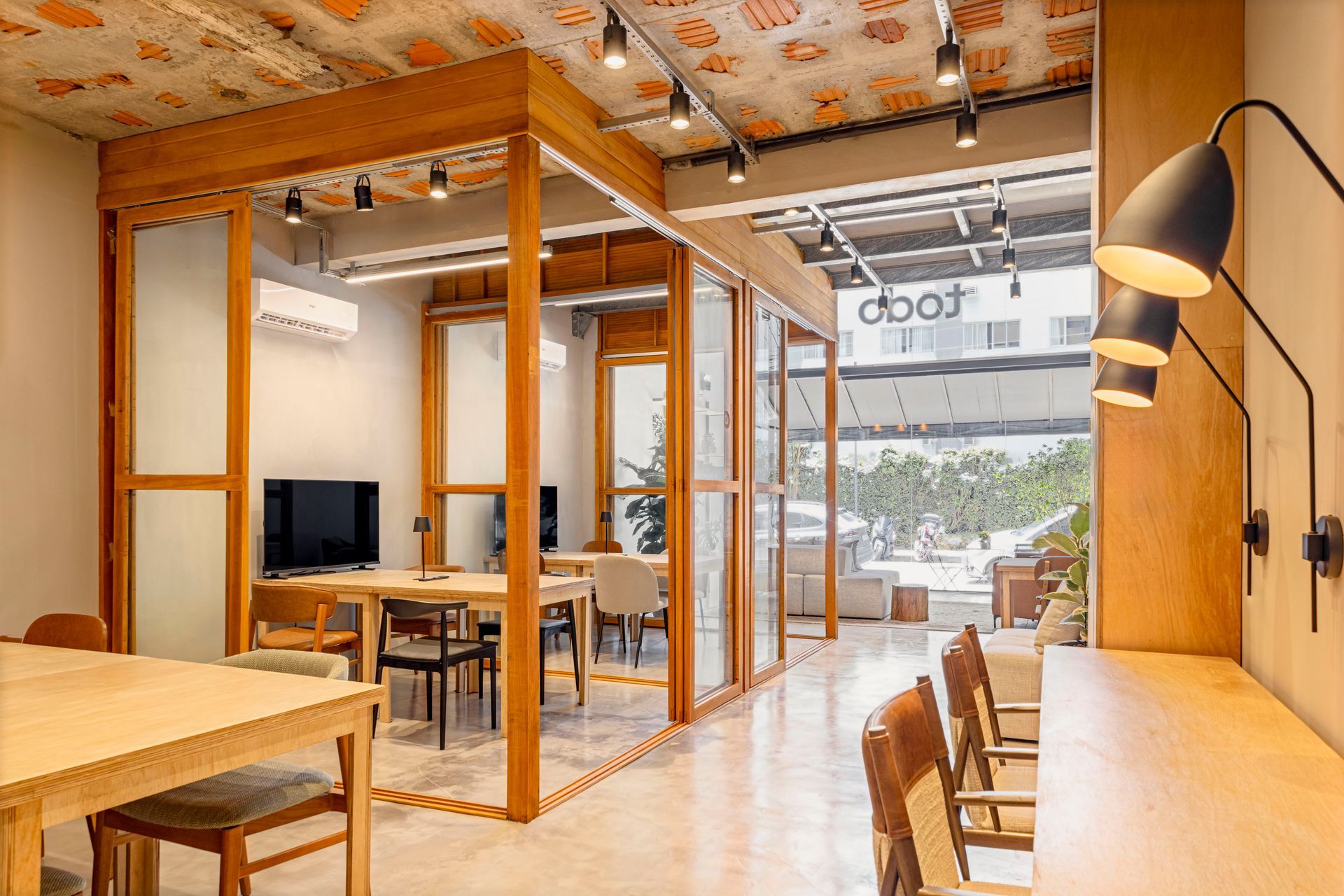 A planta foi desenhada para separar usos com clareza. No térreo, a área fica aberta ao público, com estações de trabalho e salas de reunião que podem ser alugadas, além de copa e lavabo compartilhados. No mezanino, o projeto se recolhe para o uso dos proprietários: um ambiente destinado à criação e encontros mais reservados, com área de descompressão, wine bar e lavabo exclusivo. Esquadrias de correr nas salas de reunião ajudam a regular a integração dos ambientes em dias de eventos, quando o espaço precisa ganhar continuidade.
