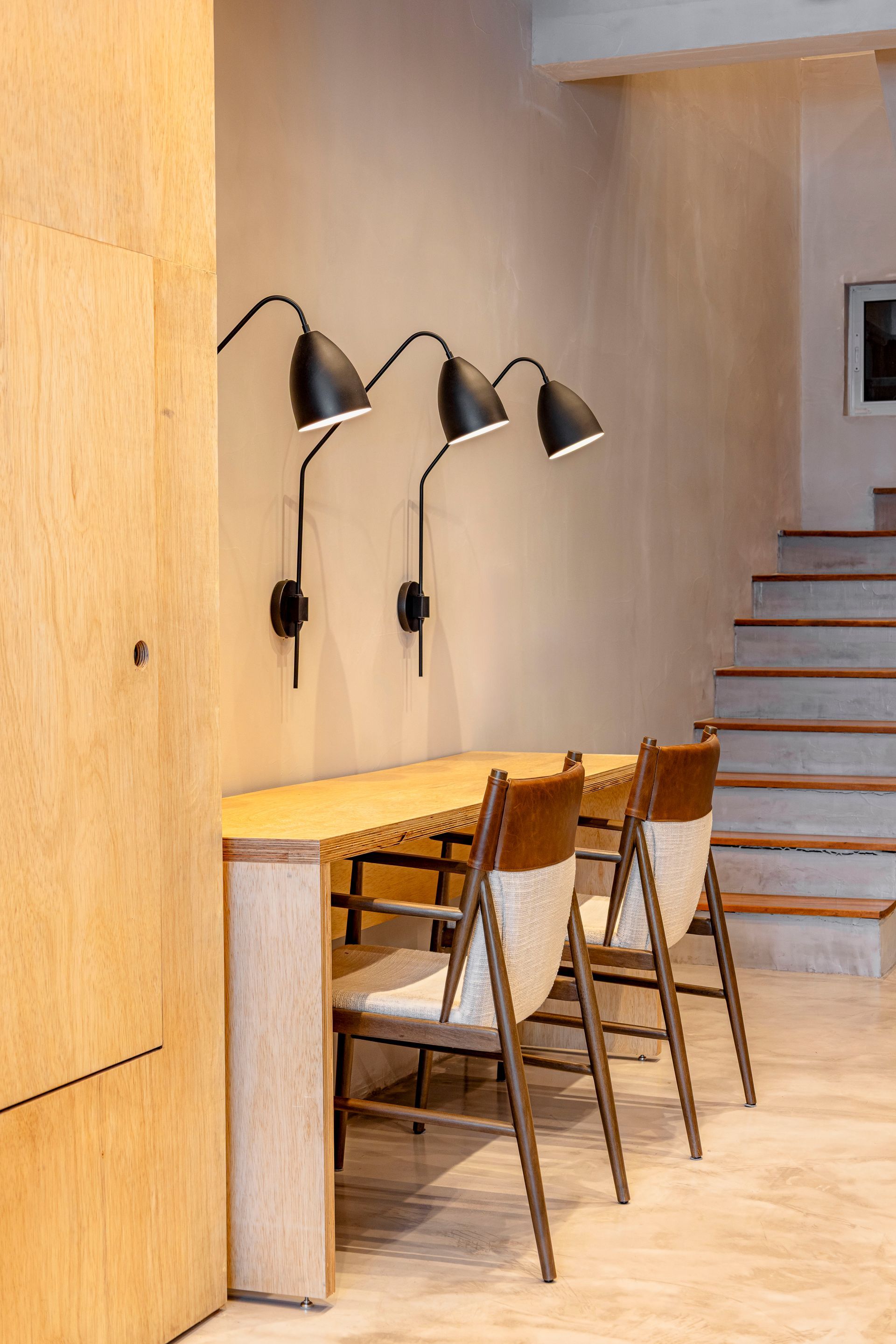 A materialidade sustenta a proposta sem recorrer a efeitos. A marcenaria em compensado naval organiza apoios e superfícies de uso cotidiano; paredes em nata cimentícia e piso em microcimento mantêm a unidade; o teto preserva a estrutura aparente, no estado bruto, recebendo iluminação em perfilado e spots. A escada em madeira cambará marca a passagem para o mezanino, onde o assoalho de eucalipto muda a temperatura do conjunto. A cor aparece, sobretudo, pelo paisagismo: o verde das plantas ocupa pontos estratégicos e faz contraste com os tons de madeira e cimento.