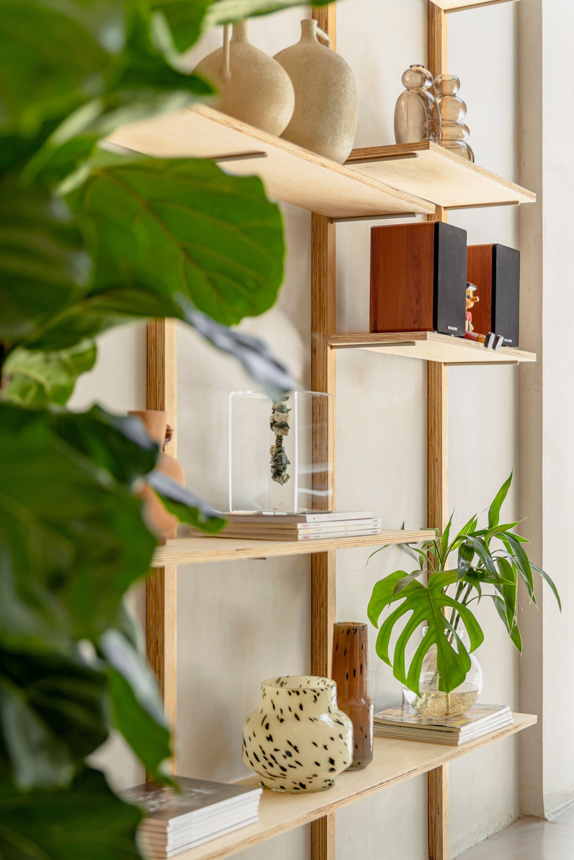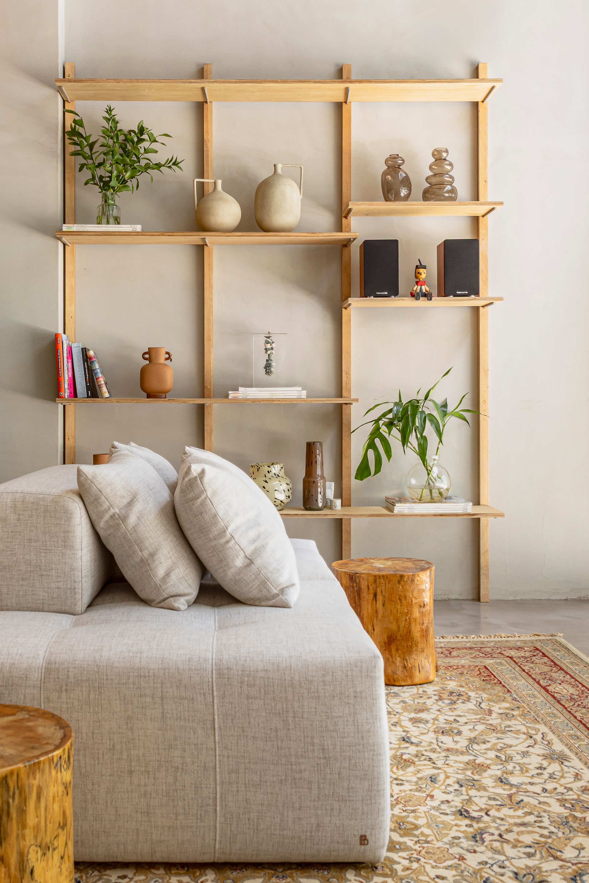 As prateleiras sob medida seguem a mesma lógica: mais do que armazenar, foram desenhadas para aceitar diferentes ativações, acompanhando projetos, objetos e mudanças de configuração ao longo do tempo.