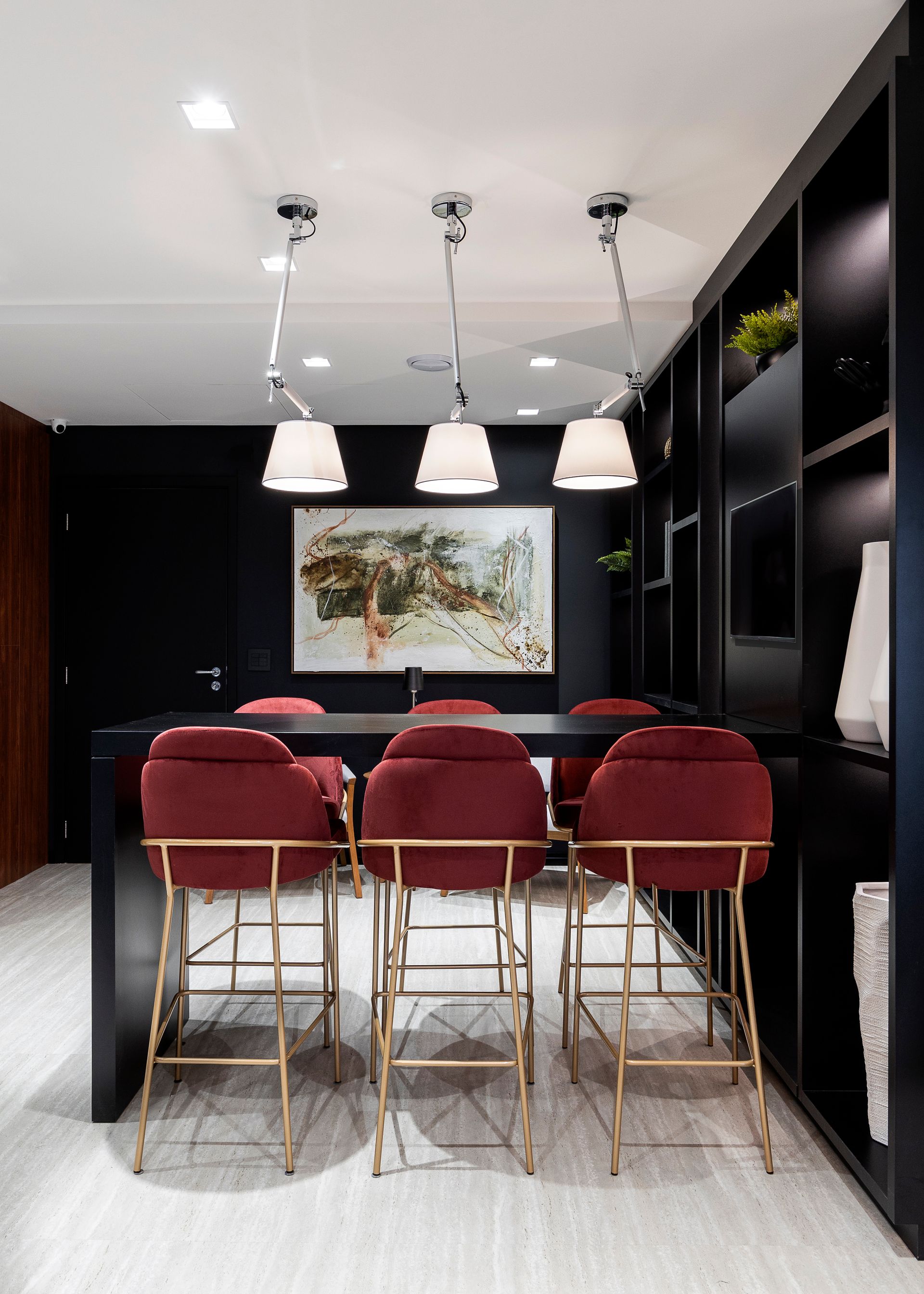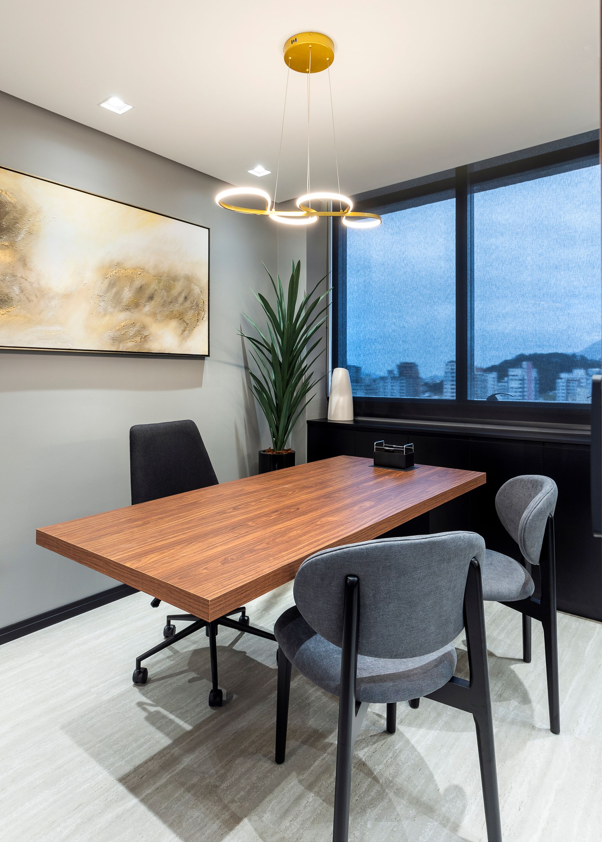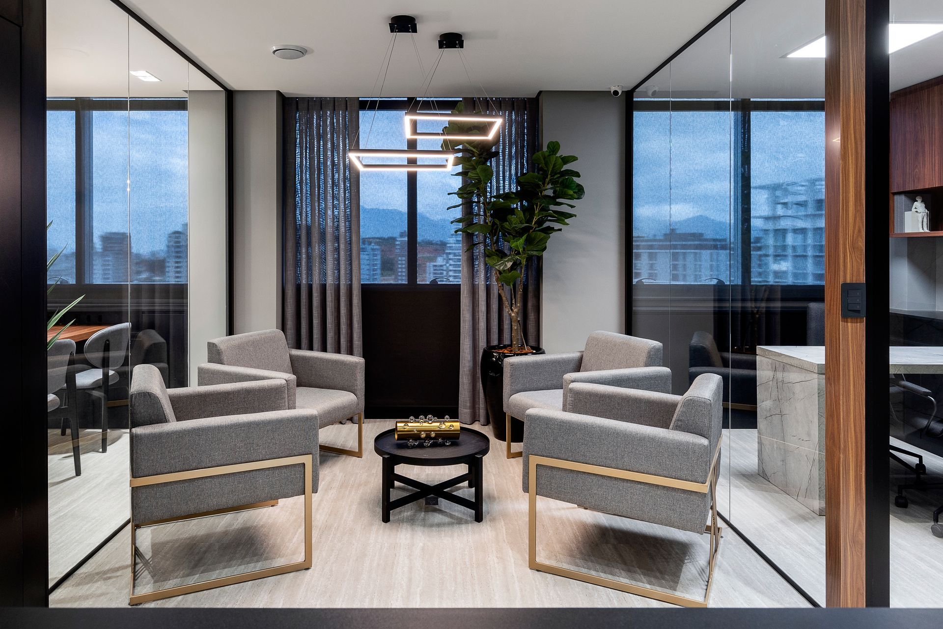 Das três salas disponíveis e integradas, a central foi projetada para ser o coração da empresa. O lounge de integração e convivência é um ponto focal, pensado para promover a interação entre os colaboradores e clientes. Com mobiliário contemporâneo e elementos de design sofisticados, este é um ambiente descontraído e inspirador para esperas, reuniões informais e momentos de relaxamento. Aqui estão as banquetas Grassi em metal dourado e revestimento em veludo bordô, as poltronas Sarau, com acabamento em madeira amêndoa, a mesa de apoio Vênus, em carvalho nogueira, e quatro poltronas Dune com a estrutura golden dispostas em torno da mesa de centro ebanizada Gala.
