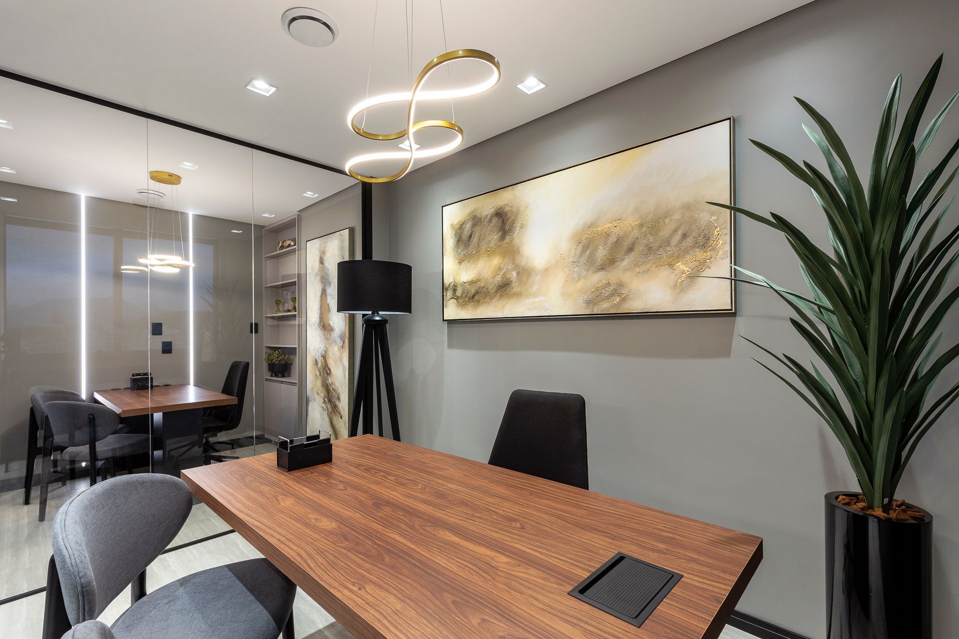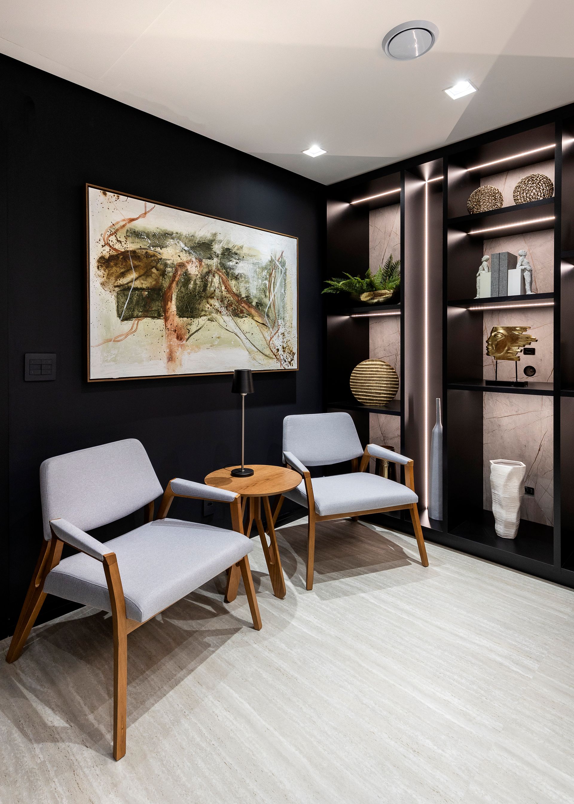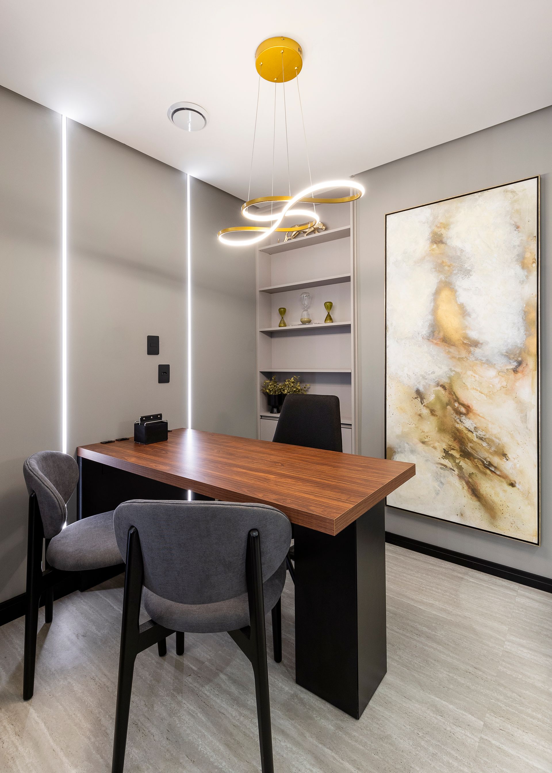 Das três salas disponíveis e integradas, a central foi projetada para ser o coração da empresa. O lounge de integração e convivência é um ponto focal, pensado para promover a interação entre os colaboradores e clientes. Com mobiliário contemporâneo e elementos de design sofisticados, este é um ambiente descontraído e inspirador para esperas, reuniões informais e momentos de relaxamento. Aqui estão as banquetas Grassi em metal dourado e revestimento em veludo bordô, as poltronas Sarau, com acabamento em madeira amêndoa, a mesa de apoio Vênus, em carvalho nogueira, e quatro poltronas Dune com a estrutura golden dispostas em torno da mesa de centro ebanizada Gala.