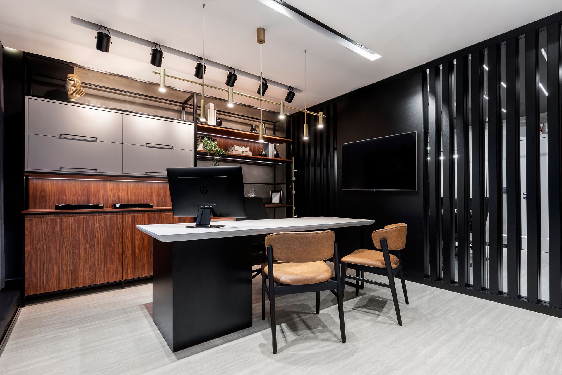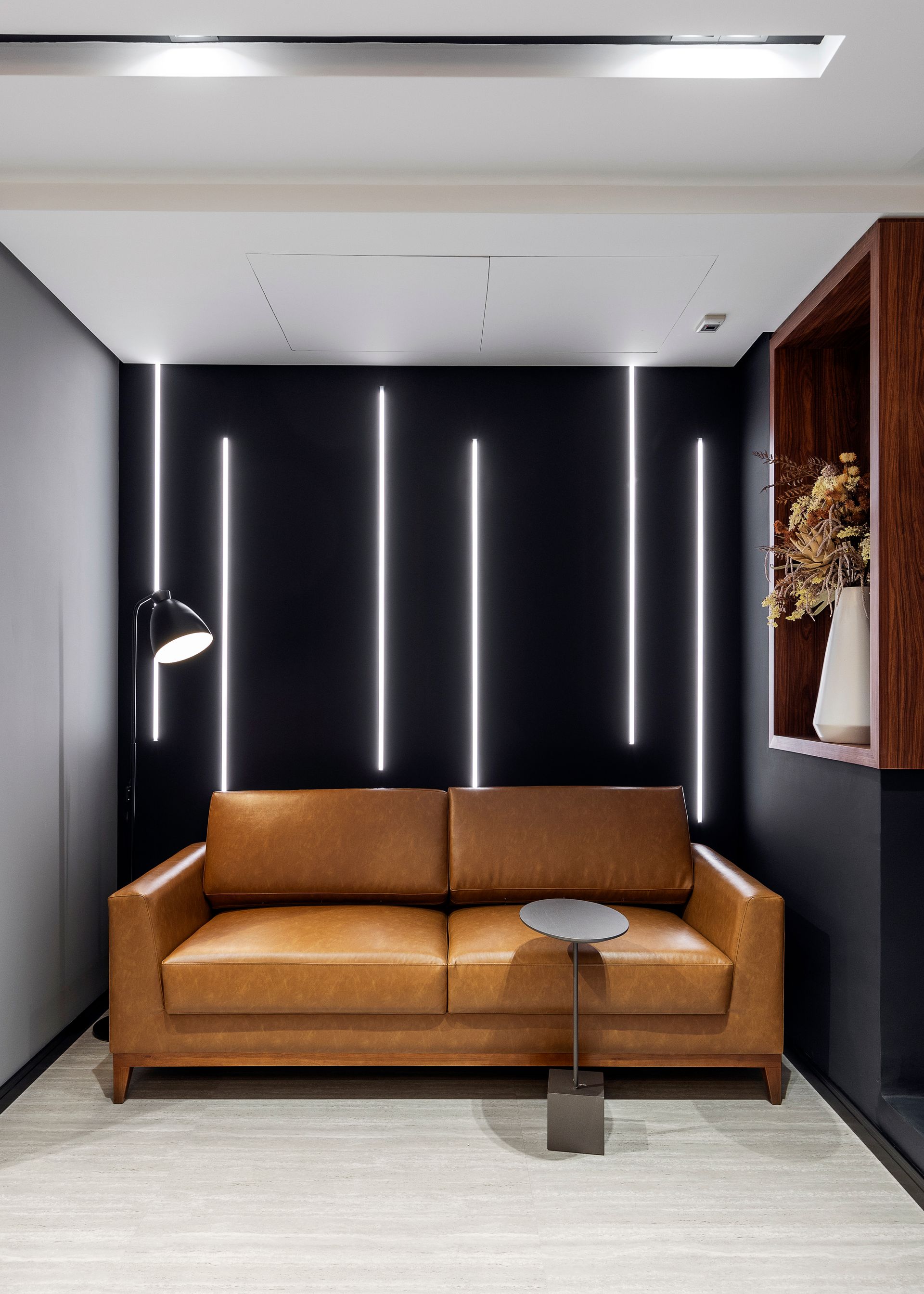 Na ala esquerda ocorrem as atividades de trabalho diário e atendimento da empresa. Logo na entrada estão a poltrona Pietra e a mesa lateral Mila, em carvalho preto. As salas ganharam um mobiliário funcional e confortável, como as cadeiras office Évora. A iluminação adequada e os materiais de revestimento criam uma atmosfera de confiança e profissionalismo.