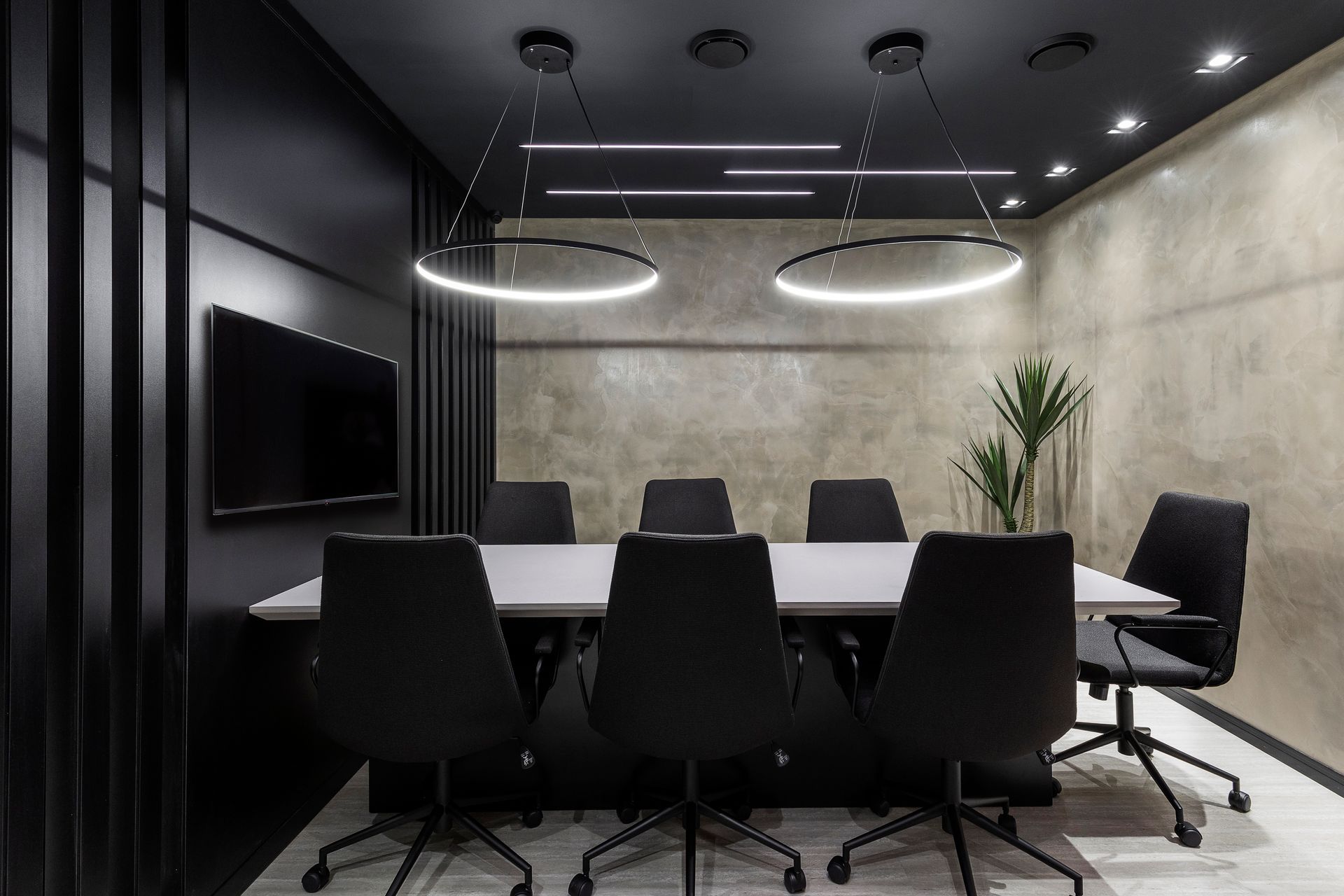 A ala direita é dedicada às áreas de diretoria. A sala de reunião principal é impressionante, com mesa de conferência, cadeiras confortáveis e equipamentos de última geração para apresentações. Uma paleta de cores sóbria enfatiza a importância dos negócios conduzidos nesse ambiente.
