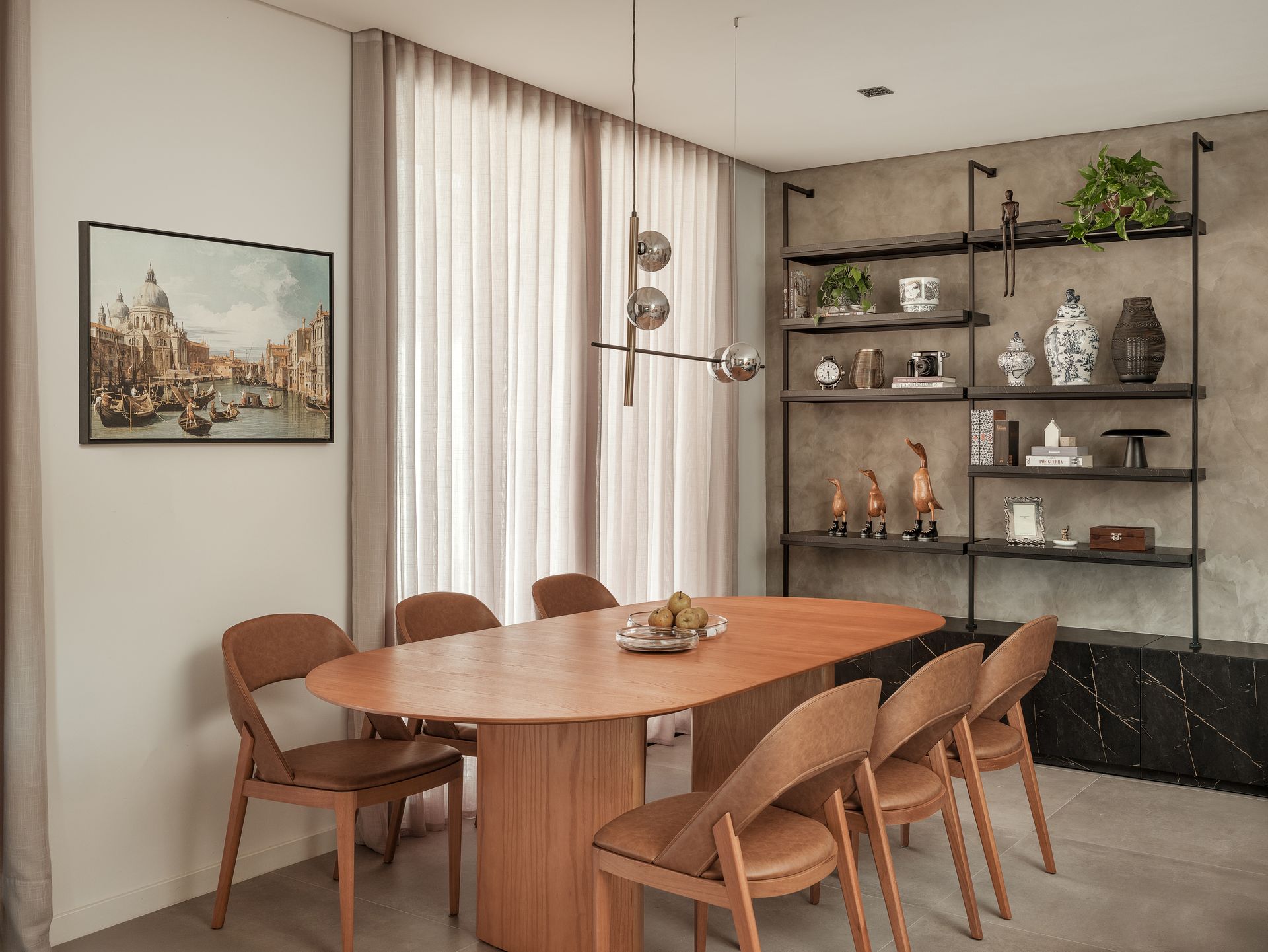 mesa de jantar Oslo — com base e tampo em carvalho nogueira — estabelece o centro da área social. Ao redor dela, as