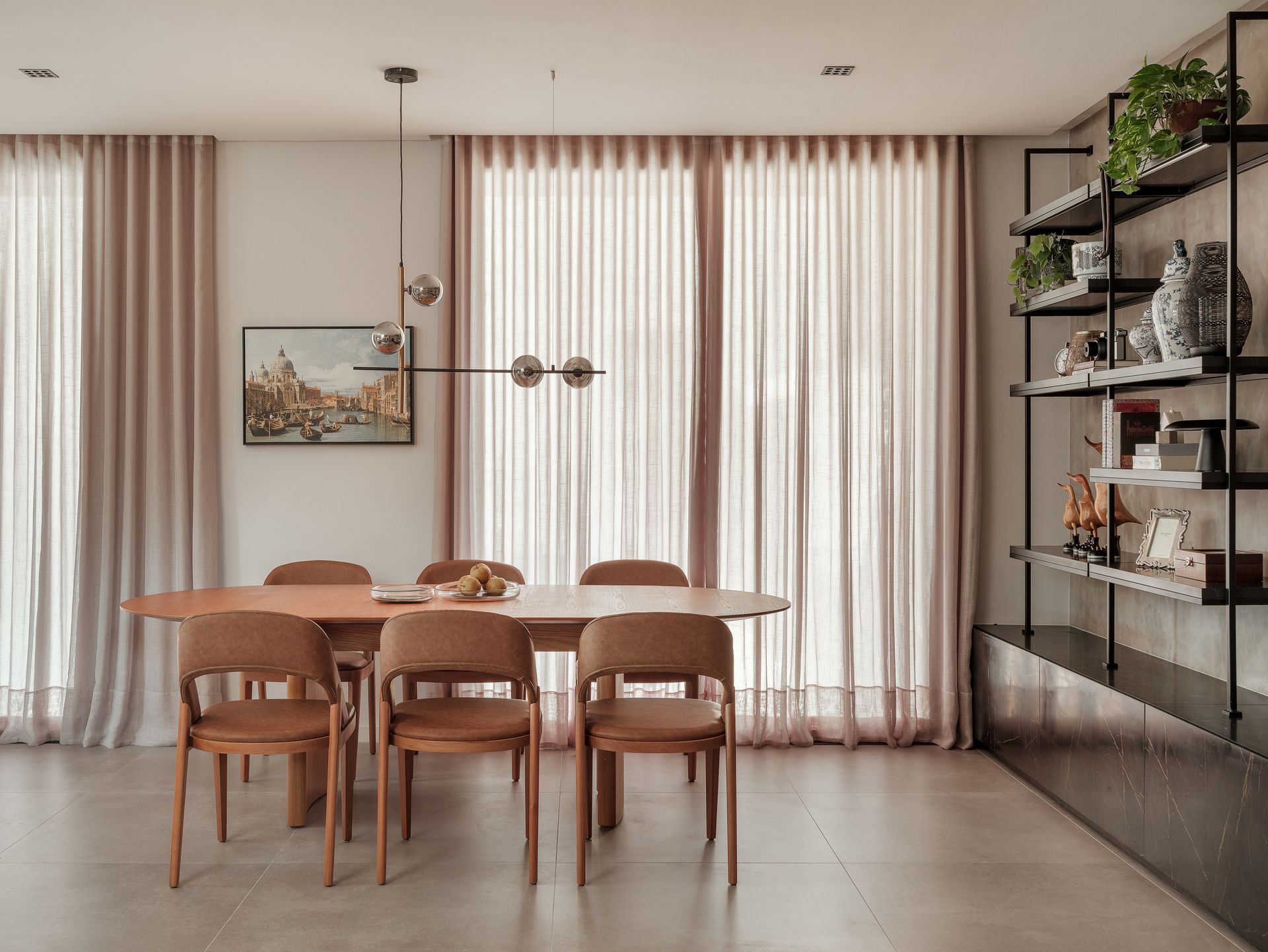 cadeiras Gia acompanham a paleta e a leveza do espaço, reforçando o diálogo entre forma e função. A